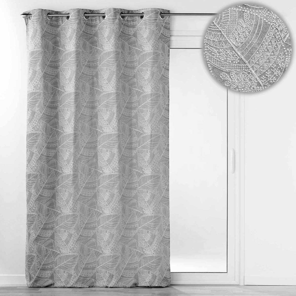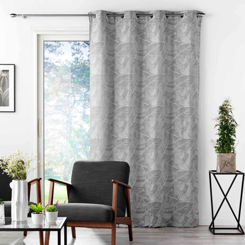 Κουρτίνα σε γκρι απόχρωση με μοντέρνο σχέδιο φύλλων. Το ύφασμα είναι ζακάρ 100% πολυεστερικό με υψηλή σκίαση. Στο επάνω μέρος διαθέτει τρουκς κρεμάσματος με διάμετρο 4cm για εύκολη τοποθέτηση. Συνδυάστε το χρώμα και το ύφος της κουρτίνας με τον χώρο σας και ανανεώστε την διακόσμησή του.