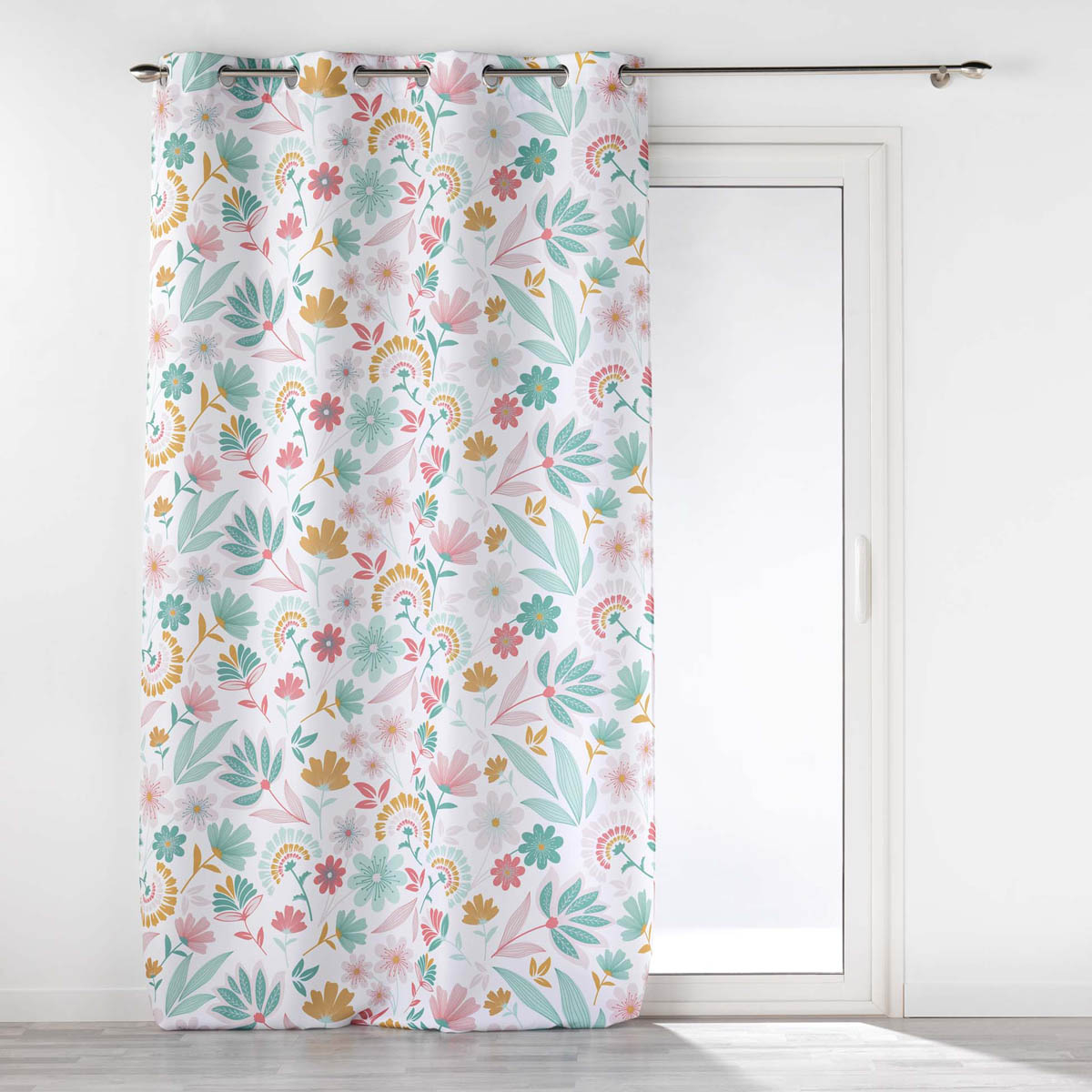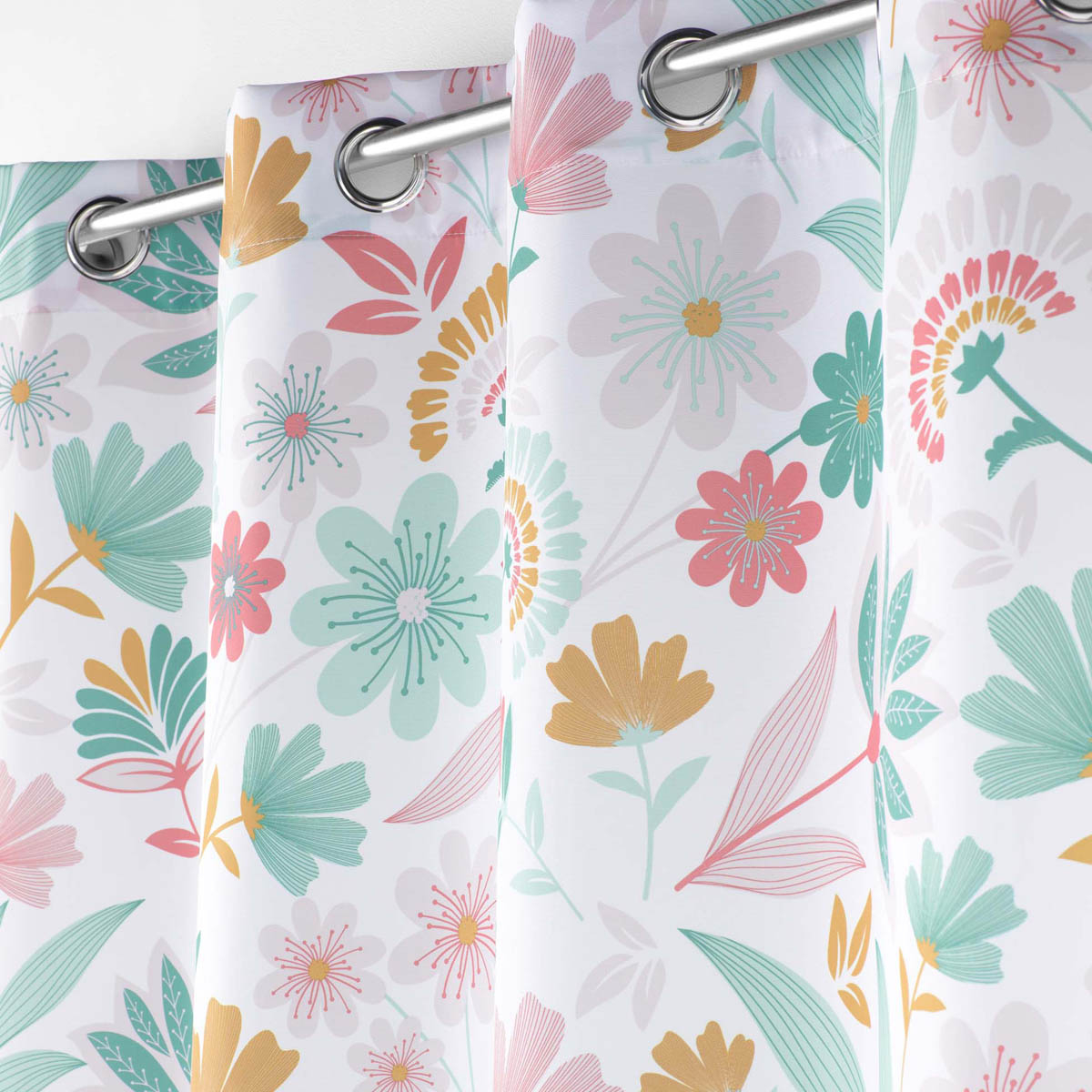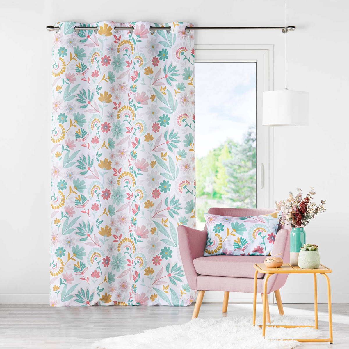 Κουρτίνα εσωτερικού χώρου σε λευκό χρώμα με πολύχρωμο φλοράλ σχέδιο. Είναι κατασκευασμένη από 100% polyester. Έχει 8 ενσωματωμένα τρουκς με διάμετρο 4cm για εύκολη τοποθέτηση. Το ύφασμα είναι μέτριας σκίασης που δεν επιτρέπει να περάσει στον χώρο πολύ φως. Συνδυάστε τη με τα υπόλοιπα είδη του ίδιου σετ για να δημιουργήστε ένα ξεχωριστό στυλ.
