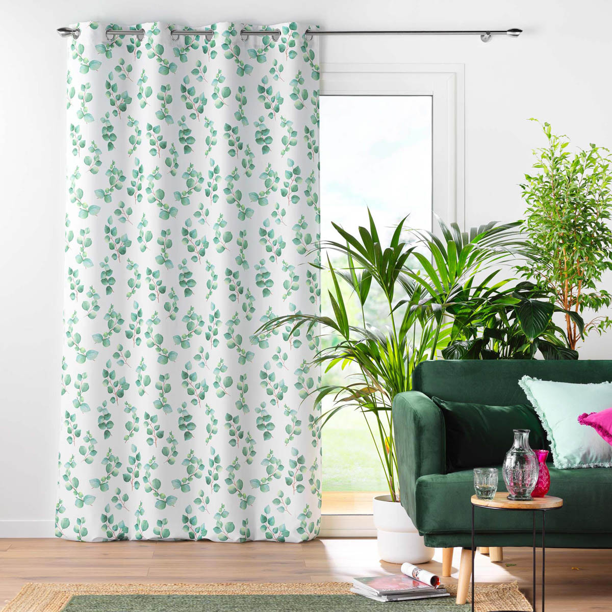 Κουρτίνα με λευκό φόντο και φλοράλ σχέδιο σε πράσινες αποχρώσεις. Το ύφασμα είναι 100% polyester με υψηλή σκίαση. Στο επάνω μέρος διαθέτει τρουκς κρεμάσματος με διάμετρο 4cm για εύκολη τοποθέτηση. Συνδυάστε το χρώμα και το ύφος της κουρτίνας με τον χώρο σας και ανανεώστε την διακόσμησή του.