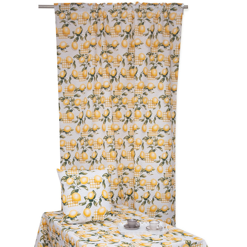 Φύλλο κουρτίνας της εταιρείας Viopros σε κίτρινο χρώμα με λευκές-πράσινες λεπτομέρειες και σχέδιο λεμόνια. Το ύφασμα είναι λονέτα από 70% βαμβάκι - 30% polyester βάρους 160gsm. Πρόκειται για ένα είδος υφάσματος που θυμίζει καραβόπανο λόγω της στιβαρότητας και της πυκνότητάς του αλλά έχει απαλότερη υφή και είναι ανθεκτικό στις πλύσεις. Έχει τρέσα για τοποθέτηση σε σιδηρόδρομο. Συνδυάστε τα με τα υπόλοιπα προϊόντα της ίδιας σειράς για ένα ολοκληρωμένο αποτέλεσμα.