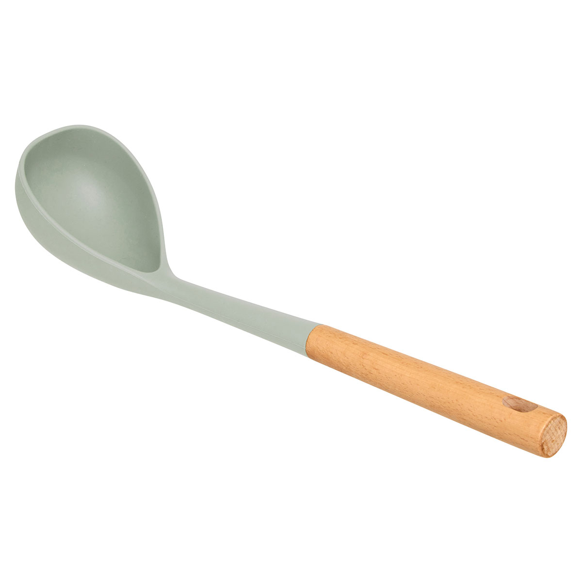 Κουτάλα σούπας κατασκευασμένη από σιλικόνη σε βεραμάν απόχρωση με μπεζ ξύλινη λαβή. Ιδανική για το σερβίρισμα σούπας, ζωμού ή σάλτσας χωρίς πιτσιλίσματα. Είναι κατάλληλη για κεραμικά και αντικολλητικά σκεύη. Διαθέτει θηλιά για να κρεμιέται.