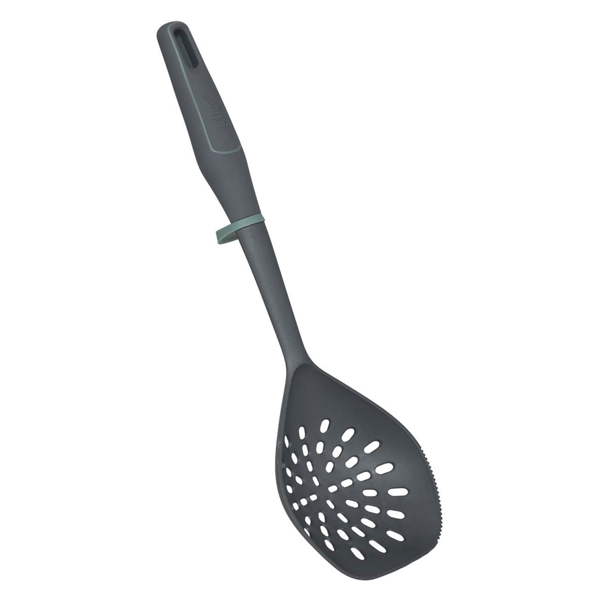 Κουτάλα τρυπητή σε γκρι χρώμα με πράσινες λεπτομέρειες. Είναι κατασκευασμένη από υψηλής ποιότητας πλαστικό υλικό κατάλληλο για επαφή με τα τρόφιμα. Διαθέτει τρύπα για να κρεμιέται. Συνδυάστε τη με τα υπόλοιπα εργαλεία κουζίνας της ίδιας συλλογής.