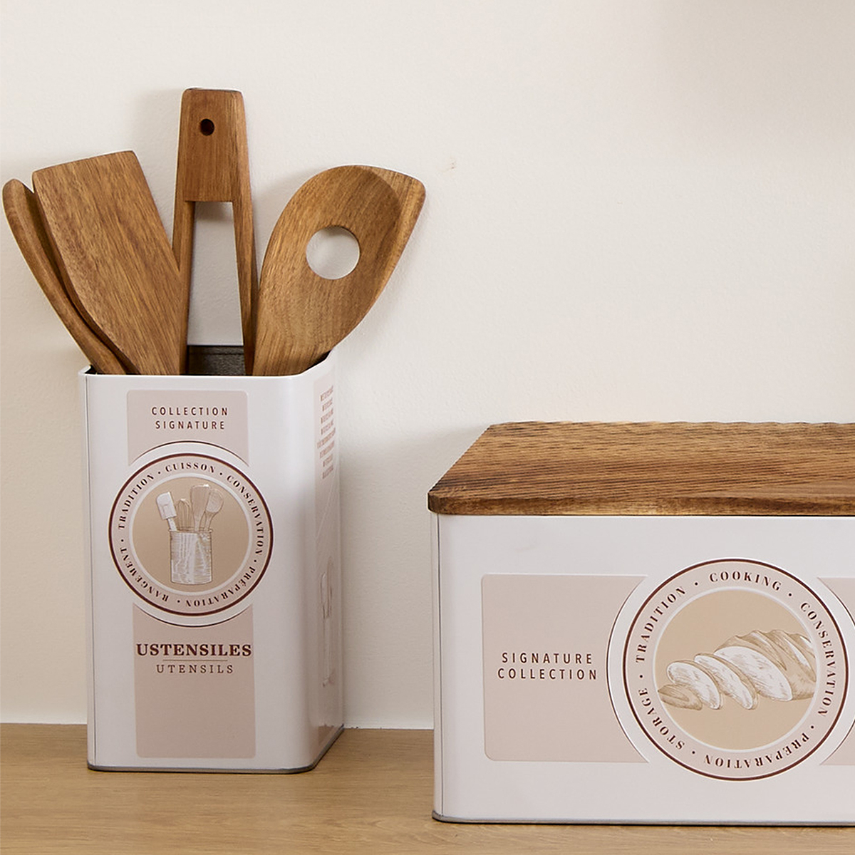 Σετ εργαλεία κουζίνας σε μεταλλική βάση. Είναι κατασκευασμένα από ξύλο ακακίας, ανθεκτικό στις υψηλές θερμοκρασίες και στο νερό. Το σετ περιλαμβάνει 2 κουτάλες, 1 σπάτουλα και 1 τσιμπίδα. Ένα χρήσιμο και πρακτικό σετ που θα ταιριάξει σε κάθε κουζίνα.