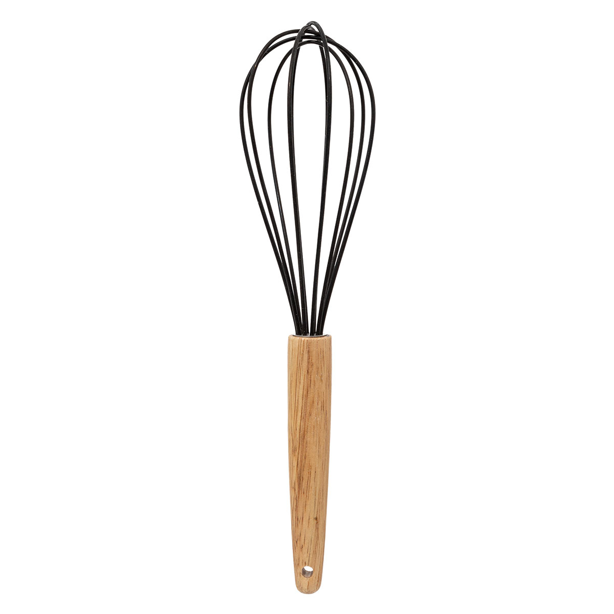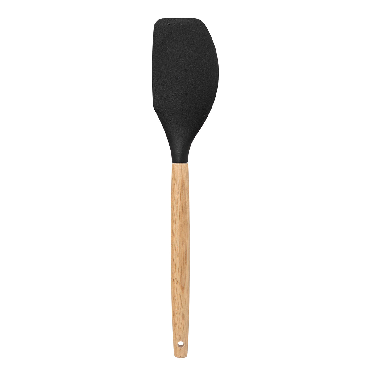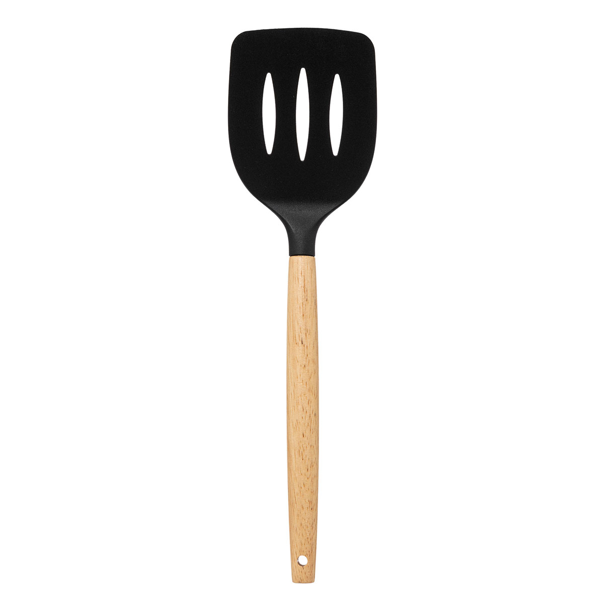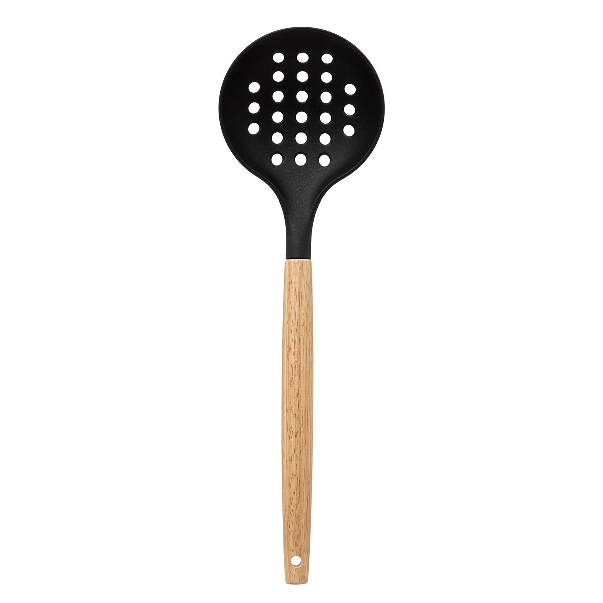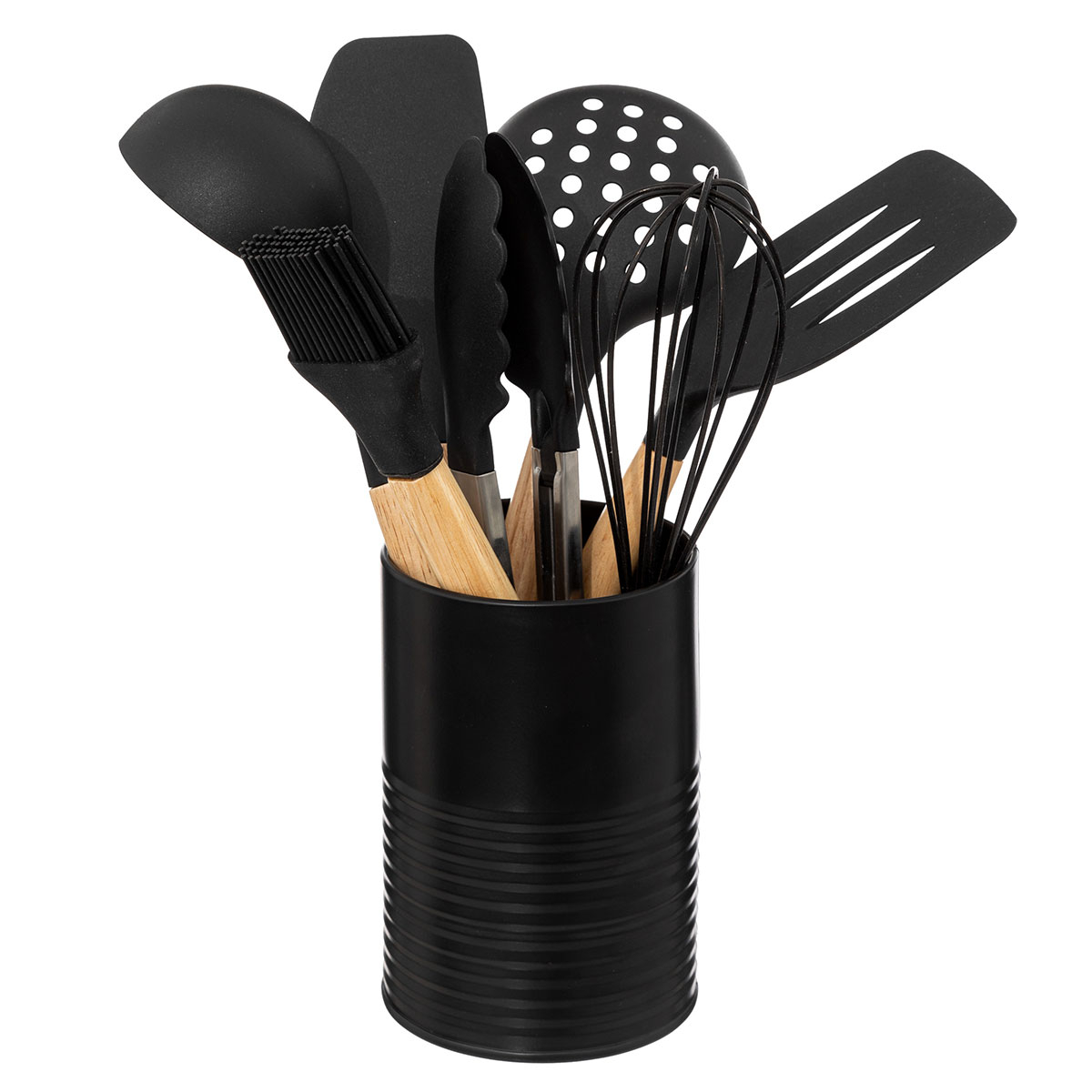 Κουτάλες μαγειρικής σετ 7 τεμάχια με βάση για να τις τοποθετείτε μέσα. Η βάση είναι κατασκευασμένη από μεταλλικό υλικό σε μαύρο χρώμα. Οι κουτάλες είναι από πλαστικό σε μαύρο χρώμα, με μπεζ ξύλινες λαβές ενώ η τσιμπίδα από μεταλλικό υλικό με μαύρο πλαστικό. Διαθέτουν οπή για να τις κρεμάτε εάν θέλετε.