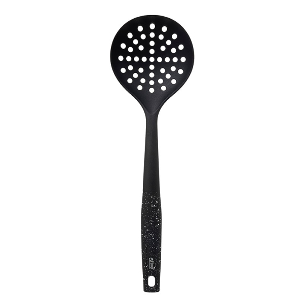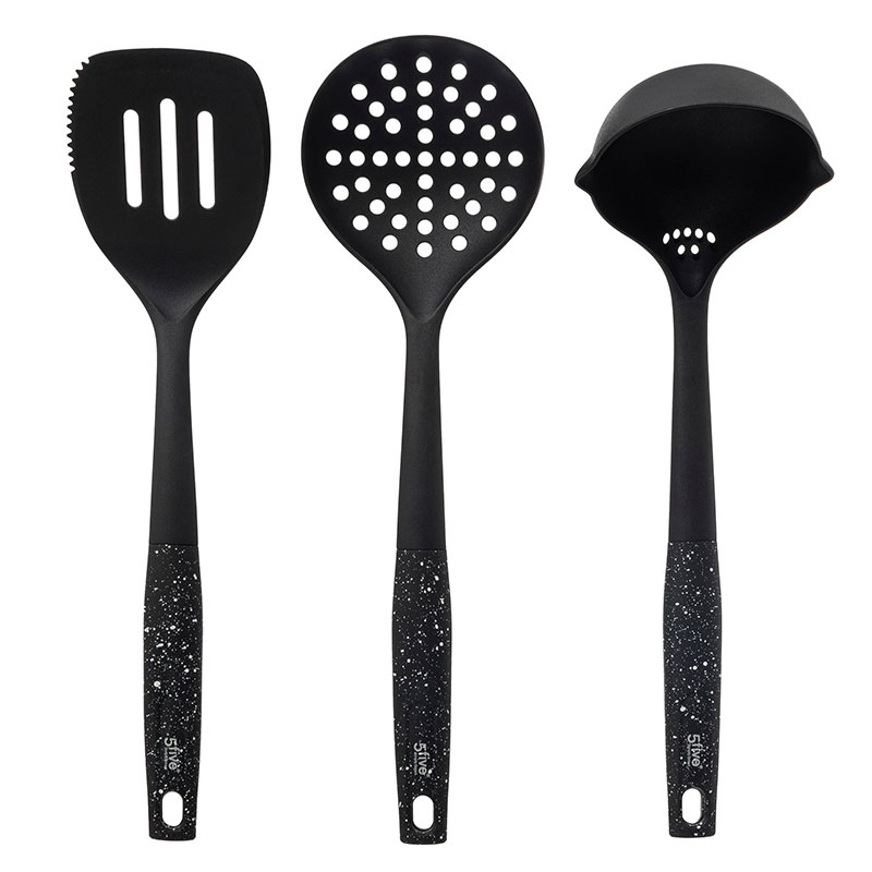 Κουτάλες μαγειρικής σετ 3 τεμάχια με λευκό πιτσιλωτό σχέδιο. Είναι κατασκευασμένες από πλαστικό υλικό σε μαύρο χρώμα. Διαθέτουν οπή για να τις κρεμάτε εάν θέλετε.