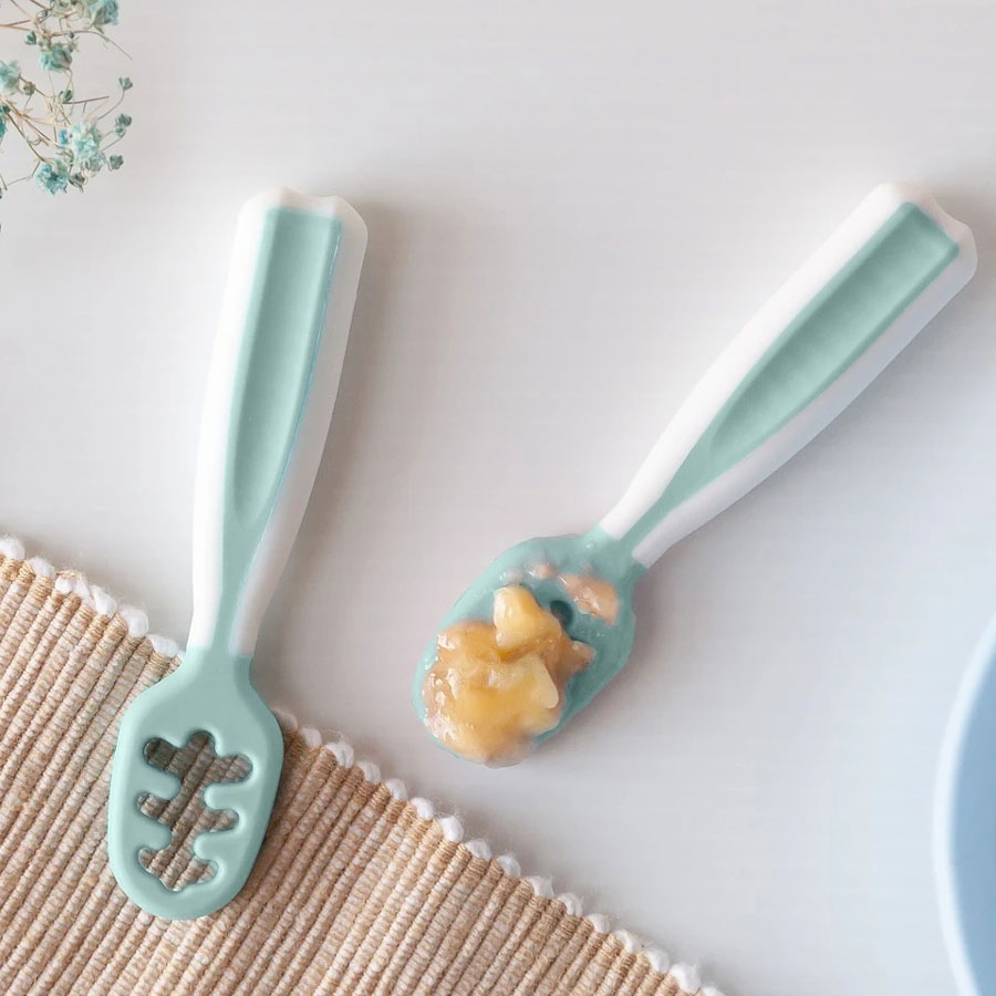 Κουτάλια φαγητού από την εταιρεία Kiokids σε βεραμάν-λευκό χρώμα. Είναι κατασκευασμένα από μαλακή σιλικόνη. To κουτάλι έχει τρύπες στο κέντρο του για να συγκρατεί το παιδί σας την τροφή και να μπορεί το πιάσει με τον τρόπο του χωρίς να χρειάζεται να περιστρέφει τον καρπό του καθώς προσαρμόζεται πλήρως στα χεράκια του. Το άκρο του κουταλιού που είναι κατασκευασμένο από θερμοπλαστικό καουτσούκ TPE που βοηθά το μωρό σας στο στάδιο της οδοντοφυΐας αφού μπορεί να χρησιμοποιηθεί και ως μασητικό ανακουφίζοντας την ενόχληση στα ούλα. Κατάλληλο για ηλικίες 6 μηνών και άνω.