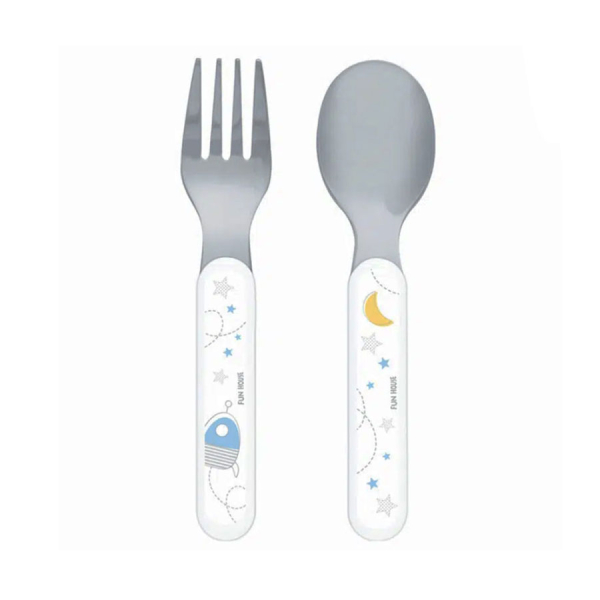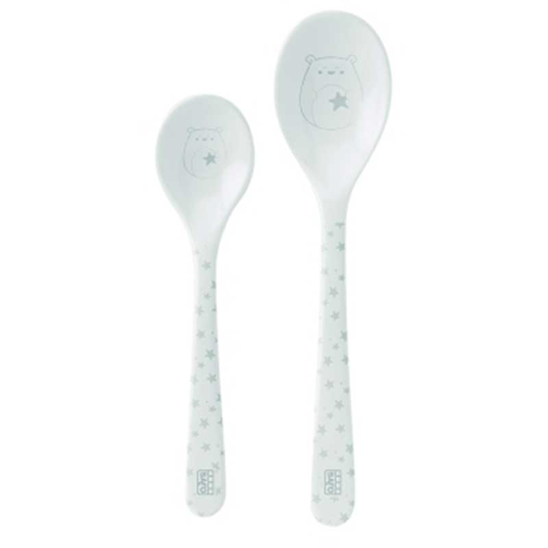 Κουτάλια φαγητού σετ σε γκρι-λευκό χρώμα και σχέδιο αρκουδάκι από την εταιρία Saro. Είναι κατασκευασμένα από μελαμίνη χωρίς BPA. Το σετ διαθέτει 2 κουτάλια διαφορετικού μεγέθους. Ιδανικό σετ για να μάθει το μικρό σας να τρώει μόνο του.