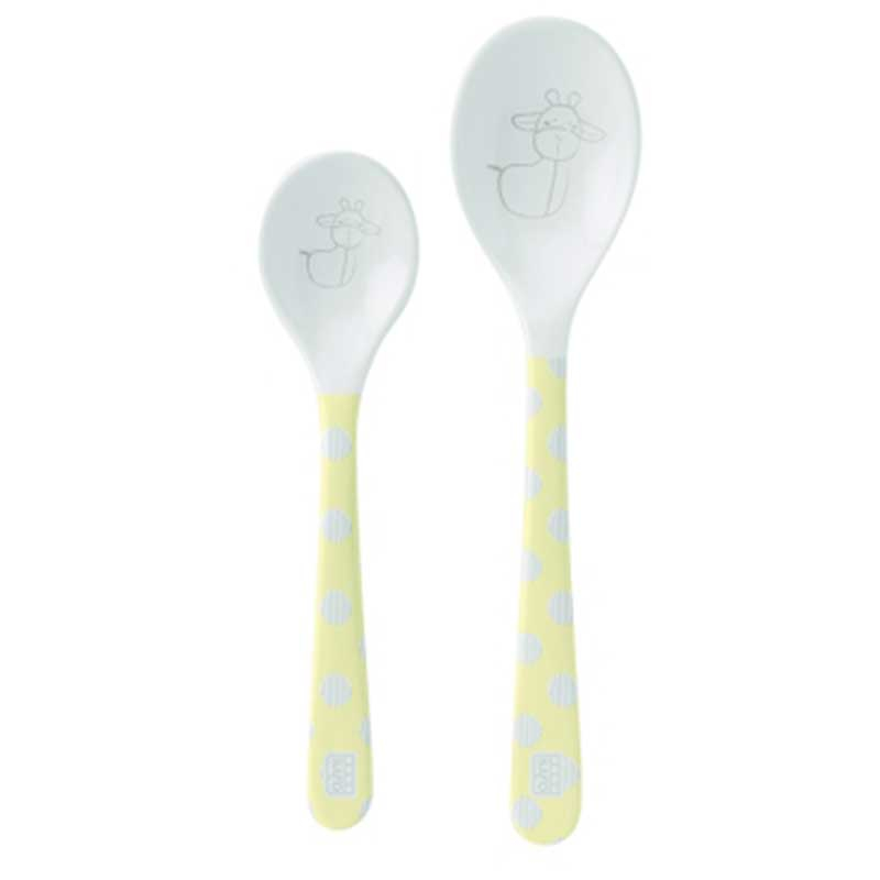 Κουτάλια φαγητού σετ σε κίτρινο-λευκό χρώμα και σχέδιο καμηλοπάρδαλη από την εταιρία Saro. Είναι κατασκευασμένα από μελαμίνη χωρίς BPA. Το σετ διαθέτει 2 κουτάλια διαφορετικού μεγέθους. Ιδανικό σετ για να μάθει το μικρό σας να τρώει μόνο του.