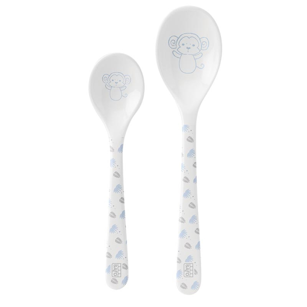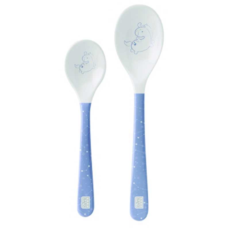 Κουτάλια φαγητού σετ σε γαλάζιο-λευκό χρώμα και σχέδιο πήγασο από την εταιρία Saro. Είναι κατασκευασμένα από μελαμίνη χωρίς BPA. Το σετ διαθέτει 2 κουτάλια διαφορετικού μεγέθους. Ιδανικό σετ για να μάθει το μικρό σας να τρώει μόνο του.