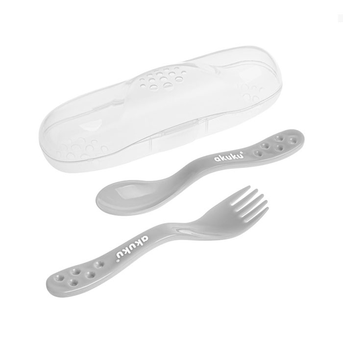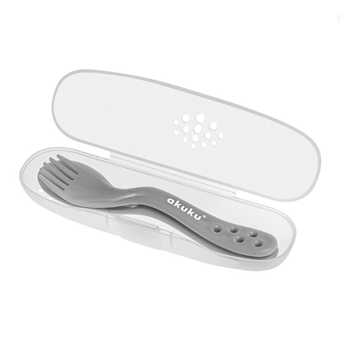 Σετ πιρούνι και κουτάλι φαγητού με θήκη από την εταιρεία Akuku. Έχουν γκρι χρώμα. Είναι κατασκευασμένα από πλαστικό και απαλλαγμένα από BPA. Ιδανικό σετ για τα μικρά και τα πρώτα τους γεύματα. Η πρακτική θήκη σας επιτρέπει εύκολη μεταφορά και εξασφαλίζει την υγιεινή του σερβίτσιου. Ιδανικά για να τα έχετε πάντα μαζί σας, στην εκδρομή, στο σχολείο και στις διακοπές.