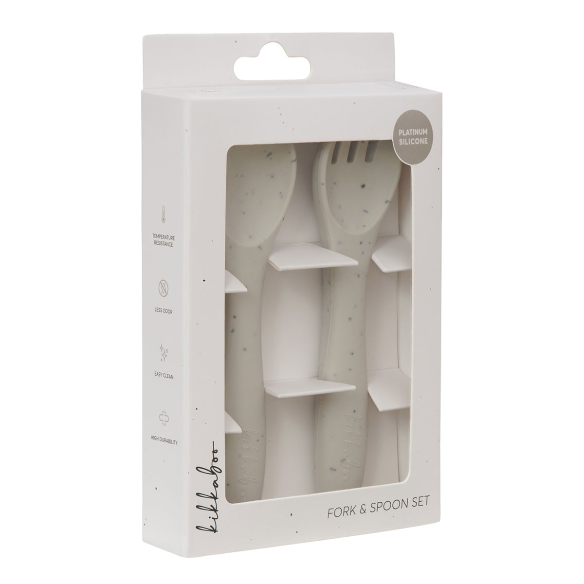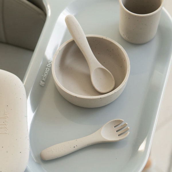 Πιρούνι και κουτάλι φαγητού σε από την εταιρεία Kikka Boo σε γκρι-μπεζ χρώμα. Είναι κατασκευασμένα από πλατινένια σιλικόνη απαλλαγμένη από BPA. Η ποιότητά τους, τους επιτρέπει να αντέχουν σε θερμοκρασίες από -40°C έως 230°C. Επίσης, είναι μαλακό, εύκαμπτο και άοσμο υλικό. Ιδανικό σετ για τα πρώτα γεύματα του μωρού κατά την περίοδο απογαλακτισμού. Ενθαρρύνει την αυτοσίτιση. Κατάλληλο για ηλικίες 6 μηνών και άνω.