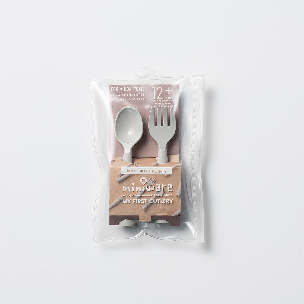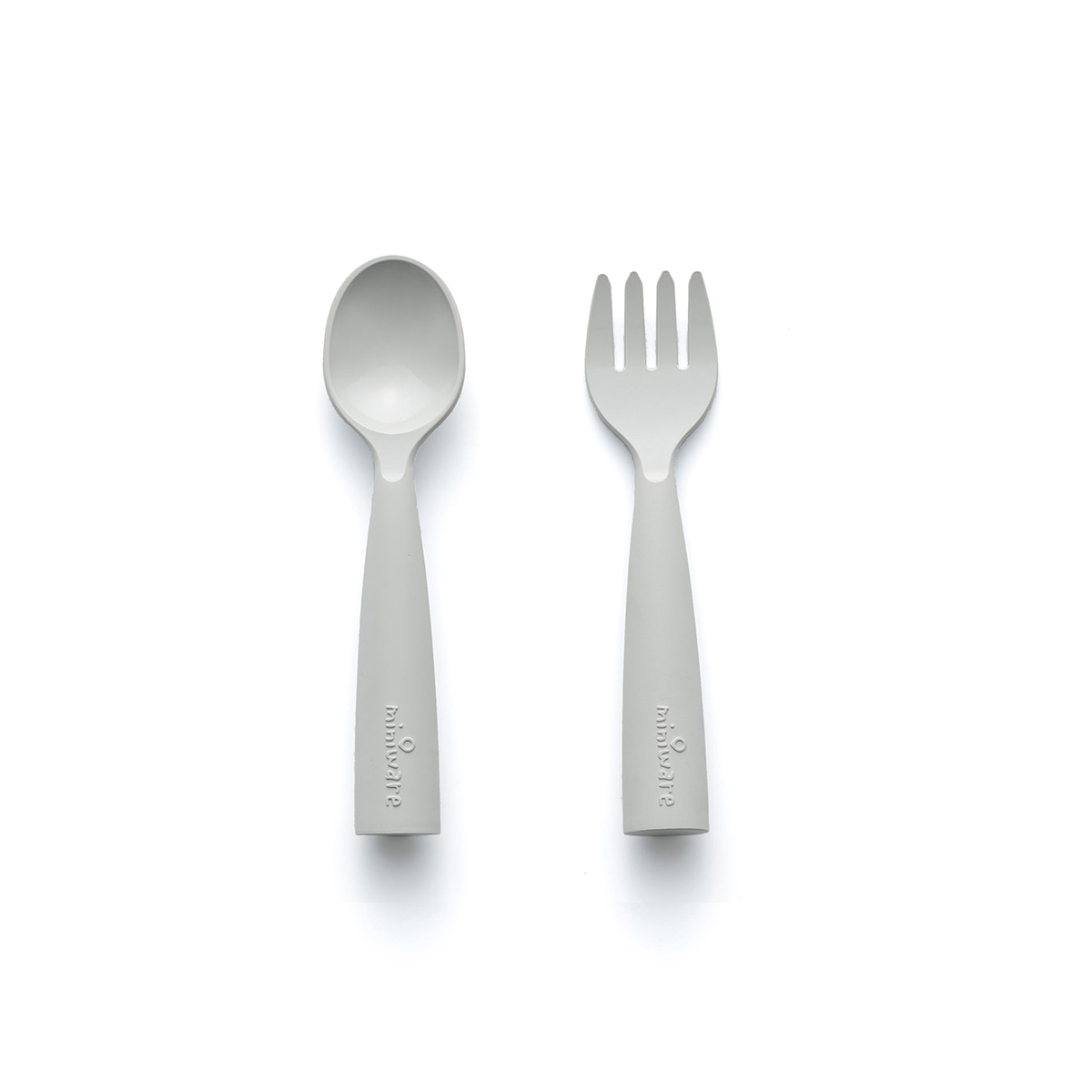 Πιρούνι και κουτάλι φαγητού σε γκρι χρώμα από την εταιρεία Miniware. Είναι κατασκευασμένα από σιλικόνη απαλλαγμένη από BPA. Η λαβή τους έχει το ιδανικό μέγεθος για τα μικρά χεράκια του παιδιού ώστε να το βοηθάει να φάει μόνο του.