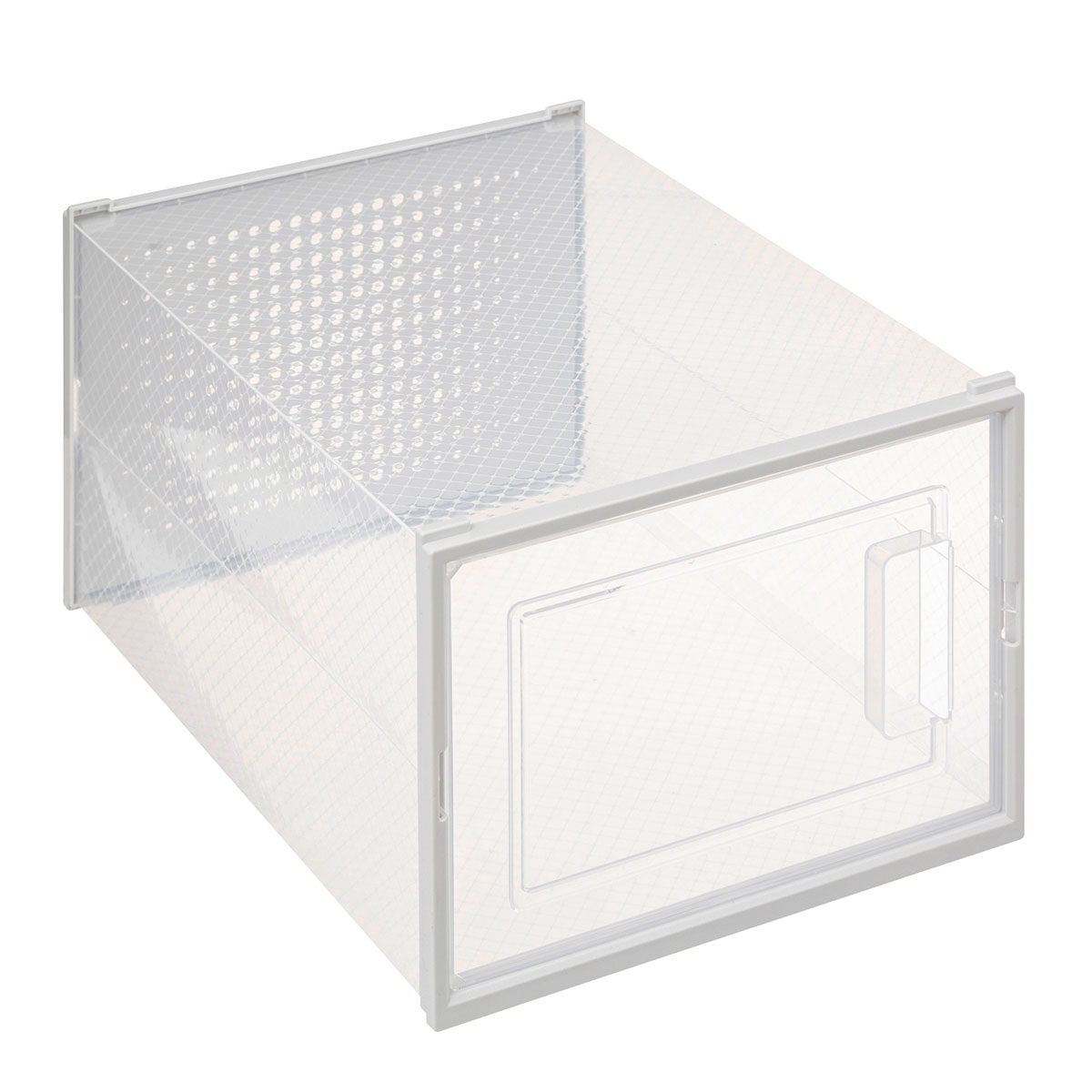Κουτί αποθήκευσης για παπούτσια. Είναι κατασκευασμένο από διάφανο πλαστικό υλικό και διαθέτει πορτάκι με λαβή. Στο πίσω μέρος έχει τρύπες για να αερίζεται ο εσωτερικός χώρος του κουτιού. Μπορείτε να το τοποθετήσετε σε κάποιο ντουλάπι ή στη είσοδο του σπιτιού. Μπορεί να φιλοξενήσει παπούτσια έως και 44 νούμερο. Ιδανικό κουτί για να έχετε πάντα τα παπούτσια σας τακτοποιημένα.