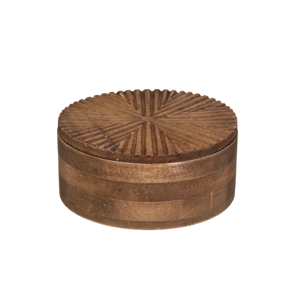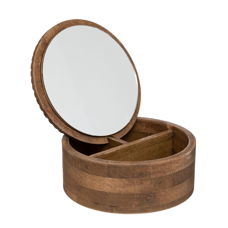 Θήκη για καλλυντικά, κοσμήματα ή αξεσουάρ με ανάγλυφο καπάκι. Είναι κατασκευασμένη από ξύλο δρυς σε καφέ χρώμα. Διαθέτει καθρέφτη στο εσωτερικό του καπακιού που στέκεται στην ειδική υποδοχή. Ιδανικό και πρακτικό κουτί για την οργάνωση του δωματίου σας.