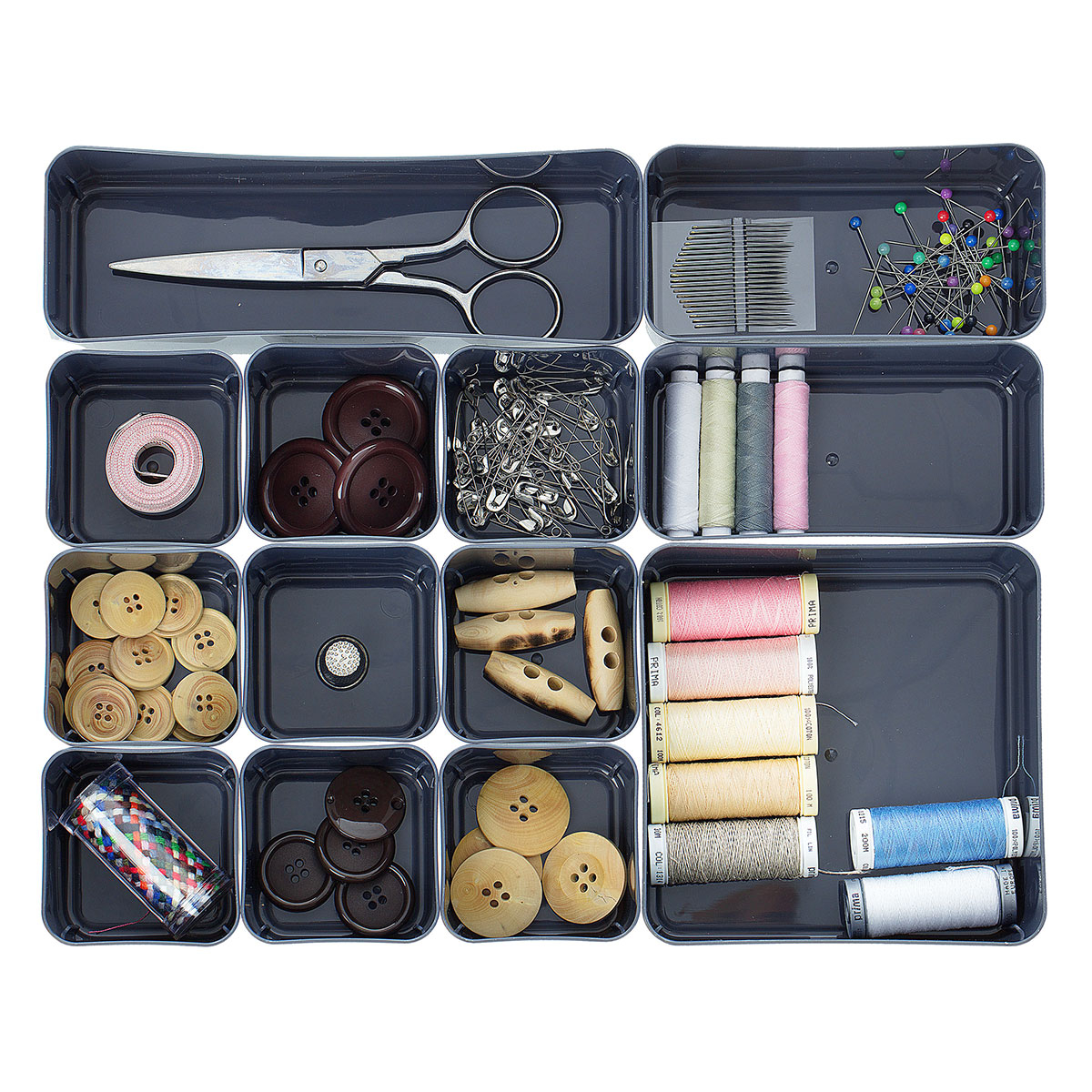 Κουτί αποθήκευσης με καπάκι με κλιπ. Είναι κατασκευασμένο από διάφανο πλαστικό υλικό με γκρι λεπτομέρειες. Διαθέτει 13 χώρους διαφορετικών μεγεθών για να τακτοποιήσετε τα μικροπράγματα σας όπως εργαλεία και ραπτικά. Μπορείτε να αφαιρέσετε τα κουτάκια και να το χρησιμοποιήσετε σαν ενιαίο αποθηκευτικό χώρο. Ιδανικό για να κρατήσει οργανωμένα τα αντικείμενά σας.