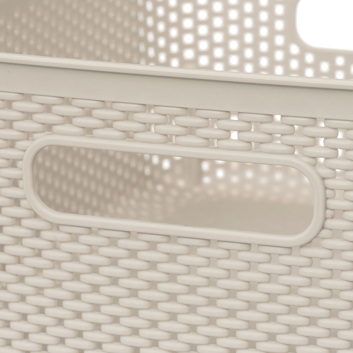 Καλάθι αποθήκευσης για την οργάνωση του μπάνιου με μοντέρνο διάτρητο σχέδιο. Είναι κατασκευασμένο από πλαστικό υλικό σε εκρού χρώμα. Διαθέτει λαβές για εύκολη μεταφορά. Μπορείτε να το χρησιμοποιήσετε σαν αποθηκευτικό χώρο σε ένα ράφι, στο μπάνιο στην κρεβατοκάμαρα ή όπου αλλού χρειάζεται να οργανώσετε μικροπράγματα. Χωρητικότητα: 4lt.