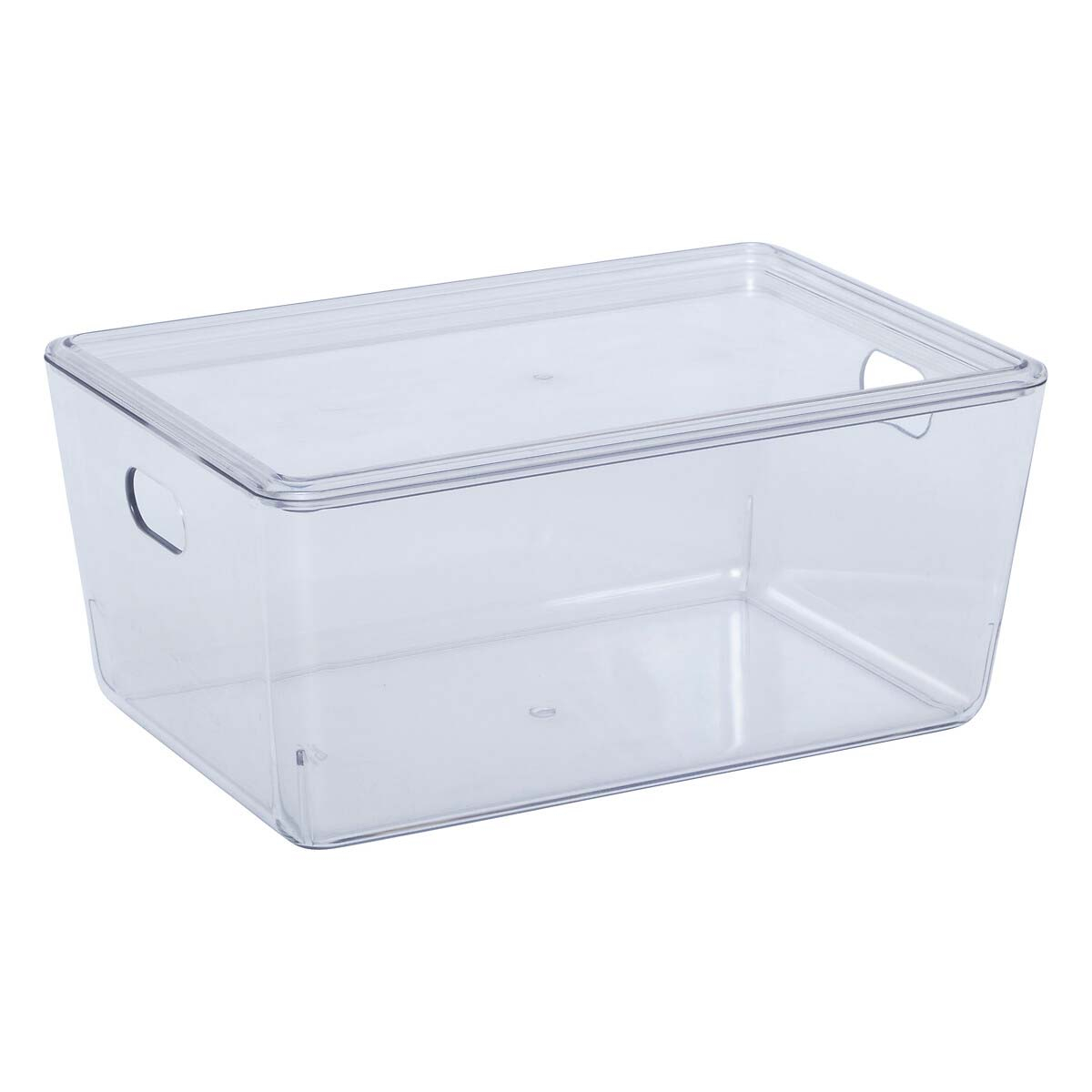 Διάφανο κουτί αποθήκευσης κατασκευασμένο από πλαστικό υλικό. Διαθέτει καπάκι και χερούλια για εύκολη μεταφορά. Χρησιμεύει σαν αποθηκευτικός χώρο σε ένα ράφι, στο μπάνιο, την ντουλάπα, το παιδικό δωμάτιο ή όπου αλλού χρειάζεται να οργανώσετε μικροπράγματα. Συνδυάστε το με τα υπόλοιπα προϊόντα του ίδιου σετ για ένα ολοκληρωμένο αποτέλεσμα. Χωρητικότητα 4lt.