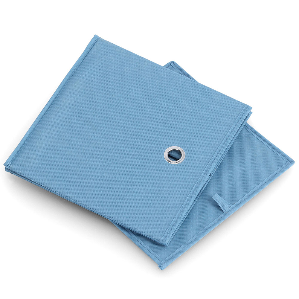 Κουτί αποθήκευσης σε μπλε χρώμα και μεταλλική οπή για να μπορείτε να το τραβάτε. Είναι κατασκευασμένο εξωτερικά από ύφασμα και εσωτερικά από χαρτόνι για να κρατάει το σχήμα του. Είναι αναδιπλούμενο και μπορείτε να το αποθηκεύσετε όταν δεν το χρησιμοποιείτε. Μπορείτε να το χρησιμοποιήσετε σε ένα ράφι για να αποθηκεύετε μικροπράγματα ή στο δωμάτιο του παιδιού.