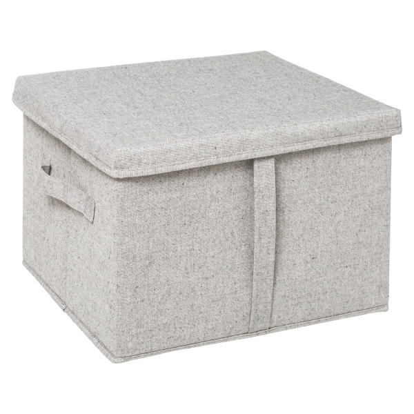 Κουτί αποθήκευσης μεγάλο σε εκρού χρώμα και χερούλι για να μπορείτε να το τραβάτε. Κατασκευασμένο εξωτερικά από ύφασμα non woven και εσωτερικά από χαρτόνι για να κρατάει το σχήμα του. Μπορείτε να το χρησιμοποιήσετε σαν αποθηκευτικό χώρο σε ένα ράφι.