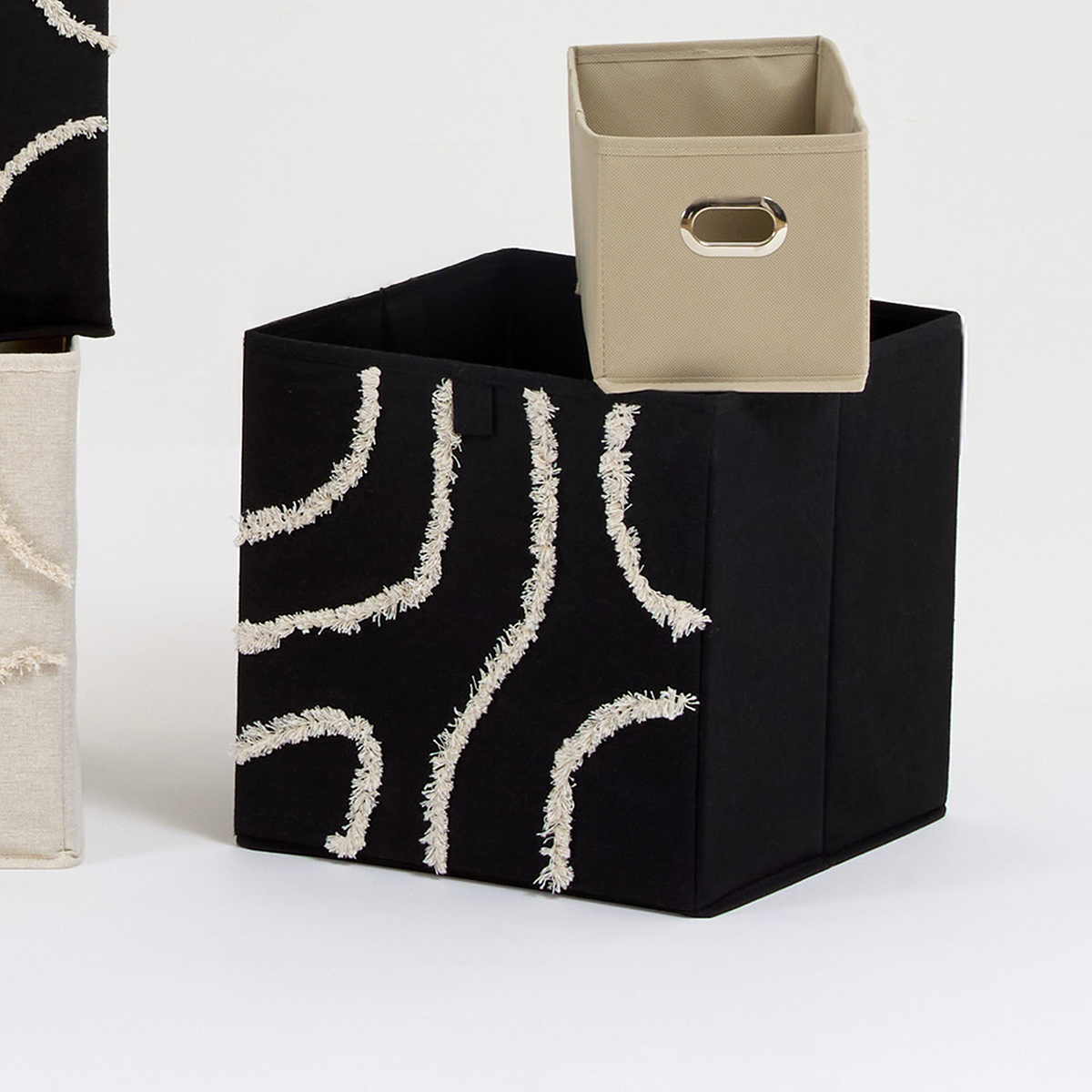 Κουτί αποθήκευσης σε μαύρο χρώμα με γκρι λεπτομέρειες. Είναι κατασκευασμένο από ύφασμα και εσωτερικά έχει χαρτόνι για να κρατάει το σχήμα του. Είναι αναδιπλούμενο και μπορείτε να το αποθηκεύσετε όταν δεν το χρησιμοποιείτε. Ιδανικό για να κρατήσει οργανωμένα τα αντικείμενά σας, δίνοντας παράλληλα μια μοντέρνα πινελιά στην διακόσμηση σας.