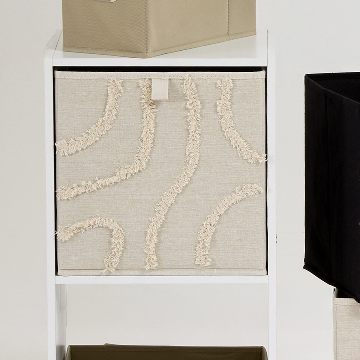 Κουτί αποθήκευσης σε εκρού χρώμα με ανάγλυφες λεπτομέρειες. Είναι κατασκευασμένο από ύφασμα και εσωτερικά έχει χαρτόνι για να κρατάει το σχήμα του. Είναι αναδιπλούμενο και μπορείτε να το αποθηκεύσετε όταν δεν το χρησιμοποιείτε. Ιδανικό για να κρατήσει οργανωμένα τα αντικείμενά σας, δίνοντας παράλληλα μια μοντέρνα πινελιά στην διακόσμηση σας.