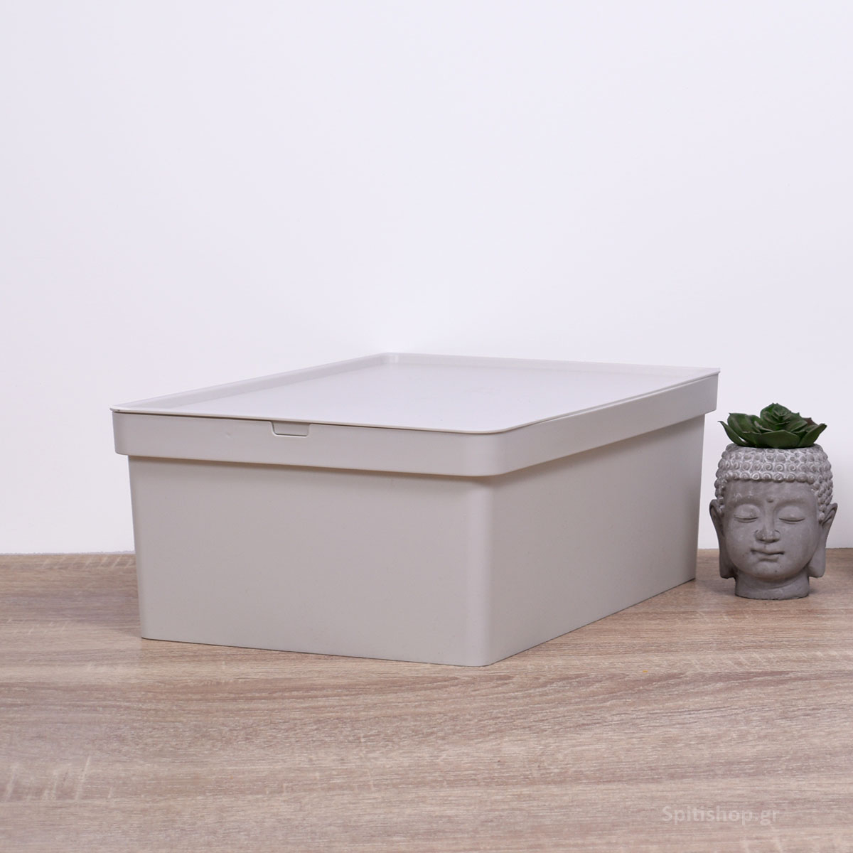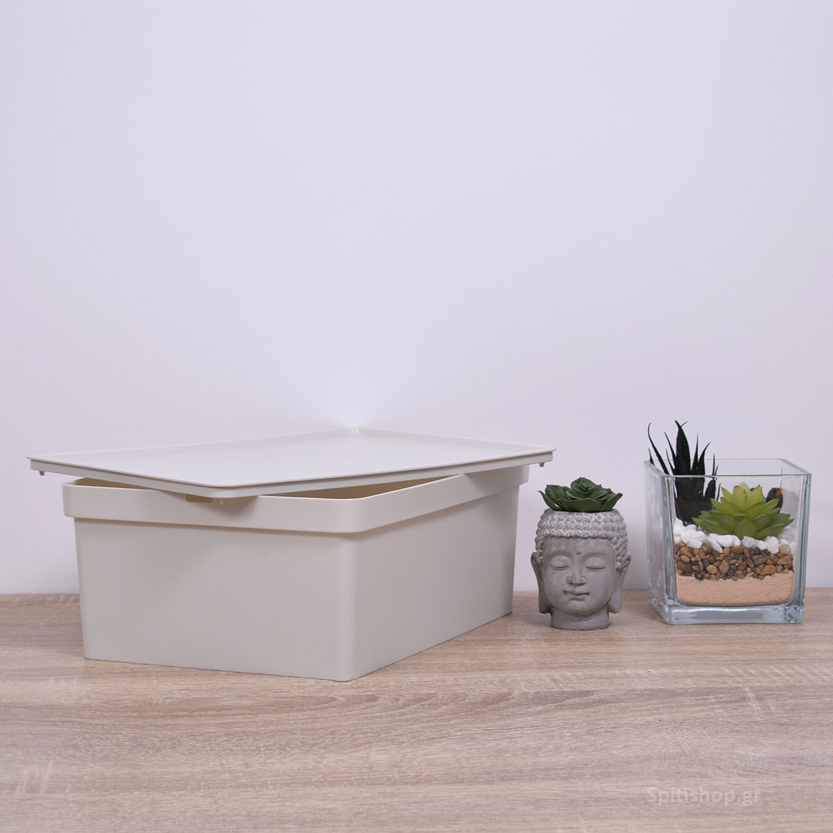 Κουτί αποθήκευσης μεγάλο 690-02 της εταιρείας Viomes, κατασκευασμένο από ανθεκτικό πλαστικό υλικό σε γκρι-εκρού απόχρωση. Διαθέτει καπάκι ώστε να προστατεύεται το περιεχόμενο του και να μπορεί να στοιβαχτεί σταθερά το ένα κουτί πάνω στο άλλο. Είναι κατάλληλο για να αποθηκεύσετε ότι επιθυμείτε και να οργανώσετε διάφορα αντικείμενα καθημερινής και μη χρήσης. Ο διακριτικός και μίνιμαλ σχεδιασμός του το καθιστά ιδανικό για όλους τους χώρους σπιτιού όπως υπνοδωμάτια, μπάνιο, κουζίνα, σαλόνι και τραπεζαρία. Είναι ιδιαίτερα χρήσιμο και στα παιδικά δωμάτια, καθώς διαθέτει στρογγυλεμένες γωνίες. Συνδυάστε το με κουτιά Nova μεγαλύτερης διάστασης ή διαφορετικής απόχρωσης για ένα ολοκληρωμένο αποτέλεσμα. Τα προϊόντα Viomes είναι ελληνικής κατασκευής και εξαιρετικής ποιότητας.