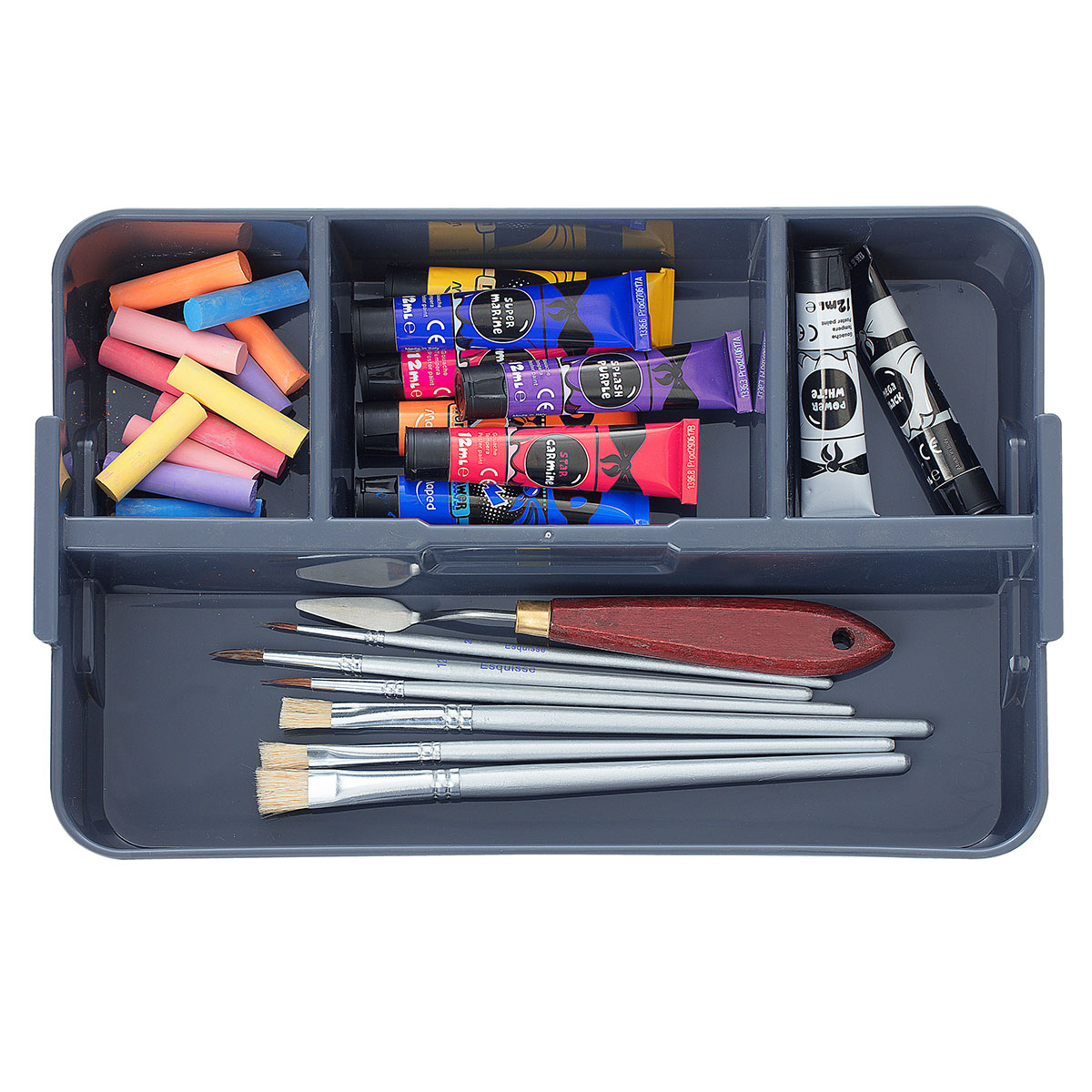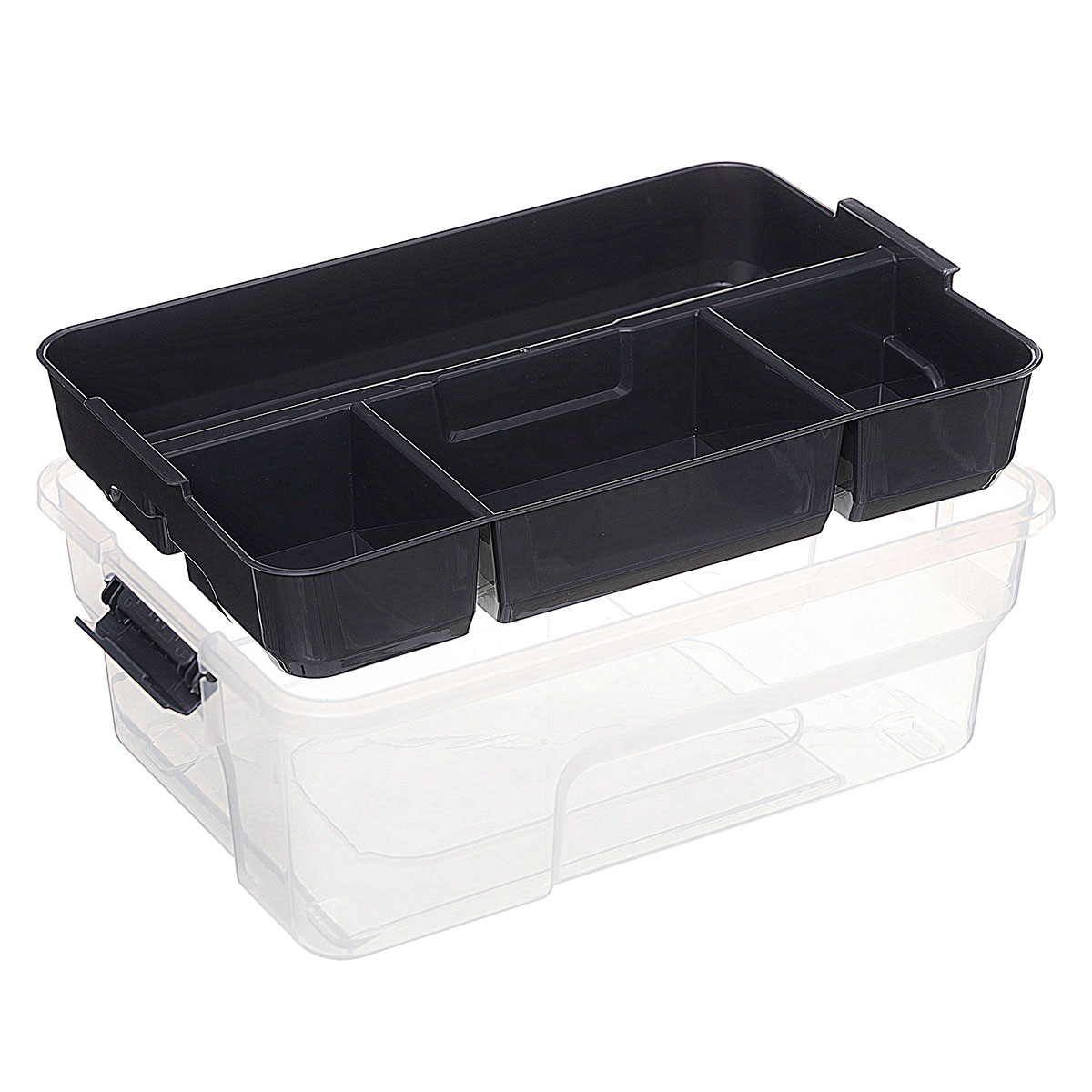 Κουτί αποθήκευσης με καπάκι με κλιπ. Είναι κατασκευασμένο από διάφανο πλαστικό υλικό με γκρι λεπτομέρειες. Διαθέτει 4 χώρους διαφορετικών μεγεθών και από κάτω ένα μεγάλο ενιαίο για να τακτοποιήσετε τα μικροπράγματα σας όπως εργαλεία και ραπτικά. Μπορείτε να αφαιρέσετε τα κουτάκια και να το χρησιμοποιήσετε σαν ενιαίο αποθηκευτικό χώρο. Ιδανικό για να κρατήσει οργανωμένα τα αντικείμενά σας.