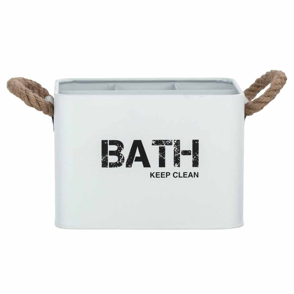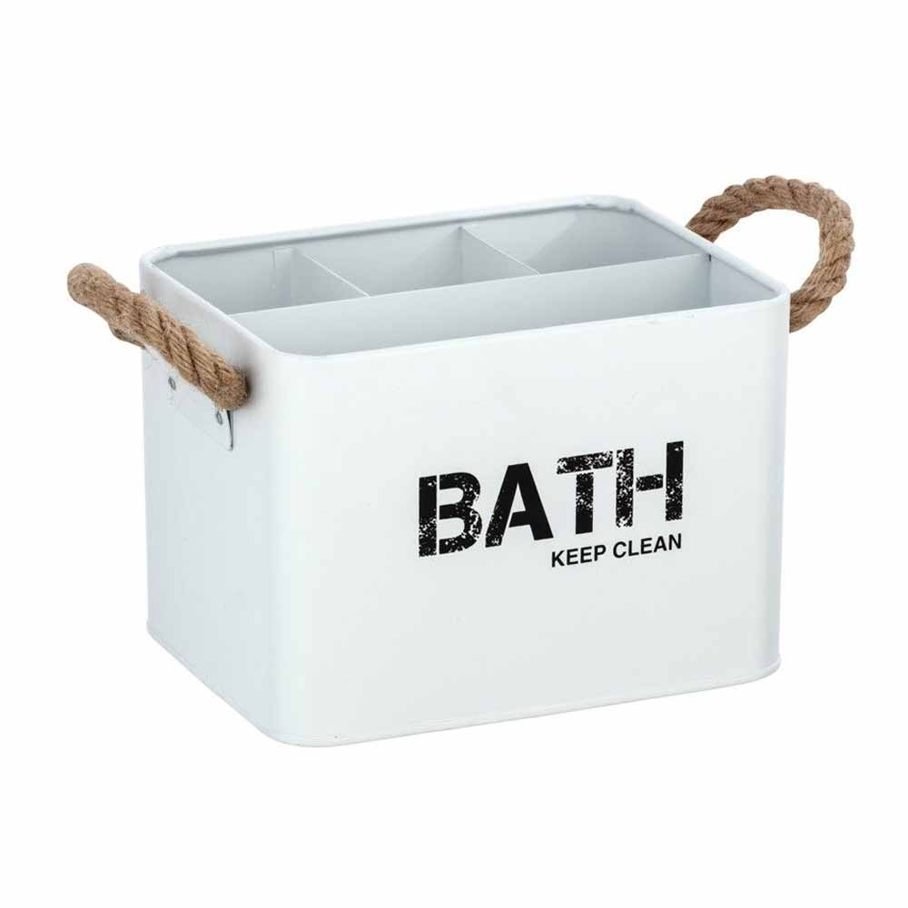 Κουτί αποθήκευσης από τη συλλογή Gara της γερμανικής εταιρείας Wenko. Είναι μεταλλικό με μοντέρνο σχέδιο και λευκό χρώμα. Έχει διαχωριστικά που δημιουργούν 4 θέσεις τοποθέτησης. Είναι ιδανικό για να οργανώσετε τις βούρτσες, τις χτένες, τις κρέμες, μέχρι και τα φάρμακά σας. Διαθέτει πλεκτές λαβές από σκοινί για πρκατικότητα και εύκολη μεταφορά.