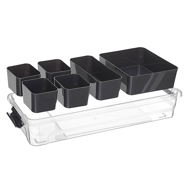 Κουτί αποθήκευσης με καπάκι με κλιπ. Είναι κατασκευασμένο από διάφανο πλαστικό υλικό με γκρι λεπτομέρειες. Διαθέτει 6 χώρους διαφορετικών μεγεθών για να τακτοποιήσετε τα μικροπράγματα σας όπως εργαλεία και ραπτικά. Μπορείτε να αφαιρέσετε τα κουτάκια και να το χρησιμοποιήσετε σαν ενιαίο αποθηκευτικό χώρο. Ιδανικό για να κρατήσει οργανωμένα τα αντικείμενά σας.