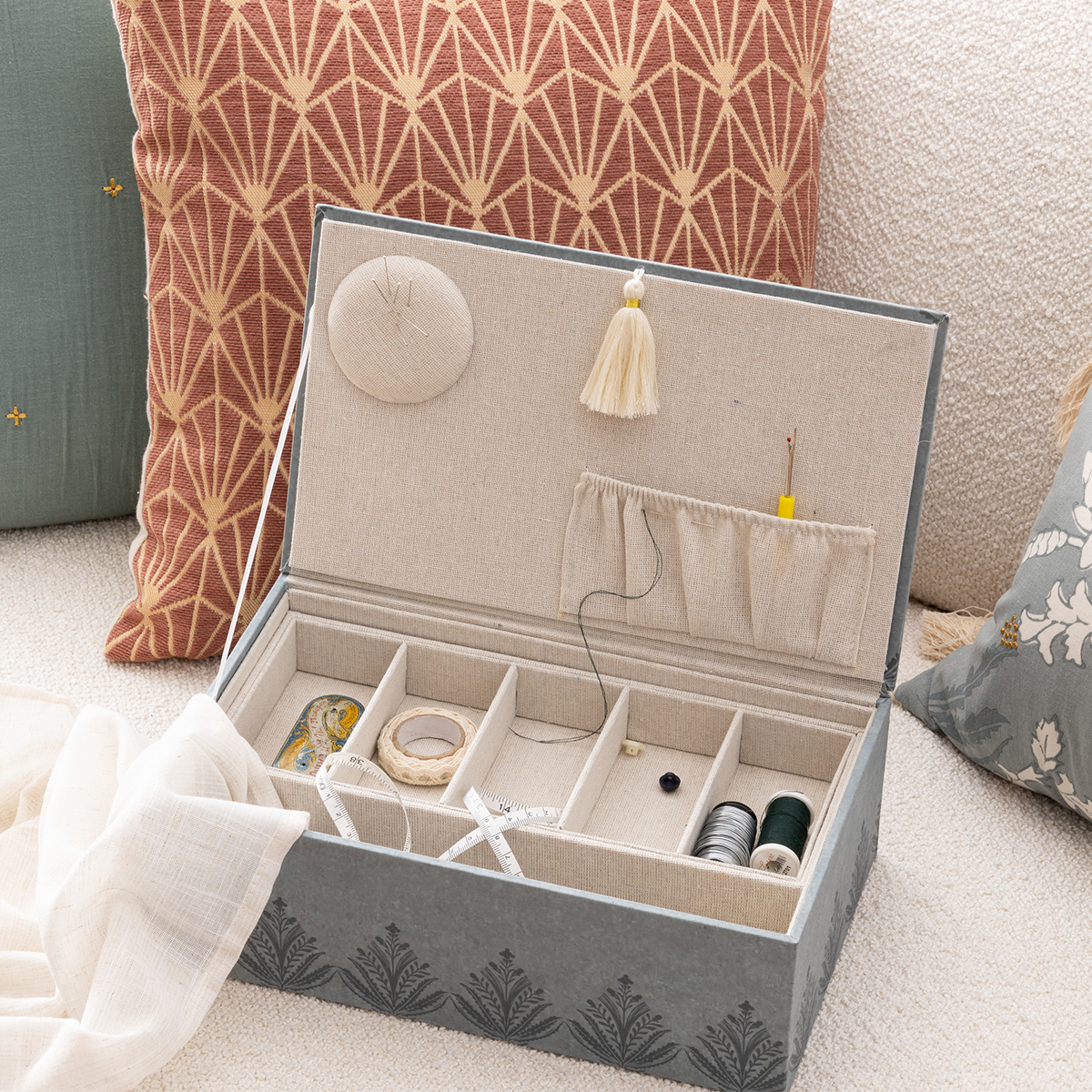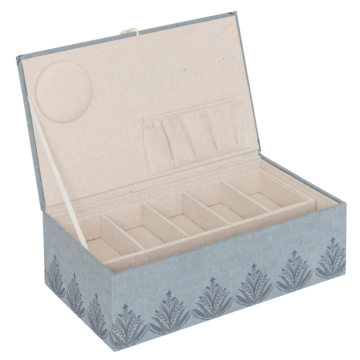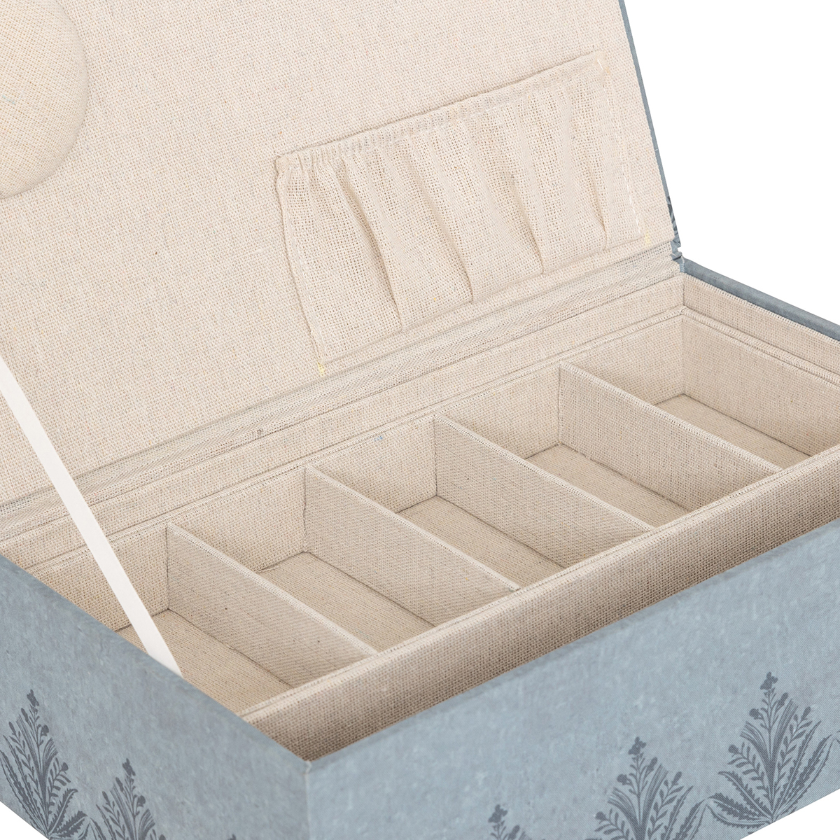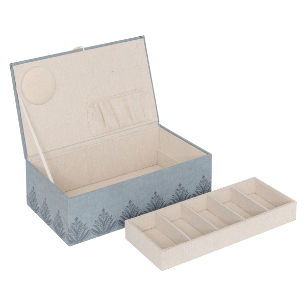 Κουτί για ραπτικά με vintage σχεδιασμό. Είναι κατασκευασμένο από ξύλο MDF_E1 σε γαλάζιο χρώμα με μπεζ εσωτερικό. Διαθέτει μια αφαιρούμενη θήκη με 5 χωρίσματα και από κάτω 1 ενιαίο χώρο. Ιδανικό για να είναι πάντα τακτοποιημένα και οργανωμένα τα ραφτικά σας.