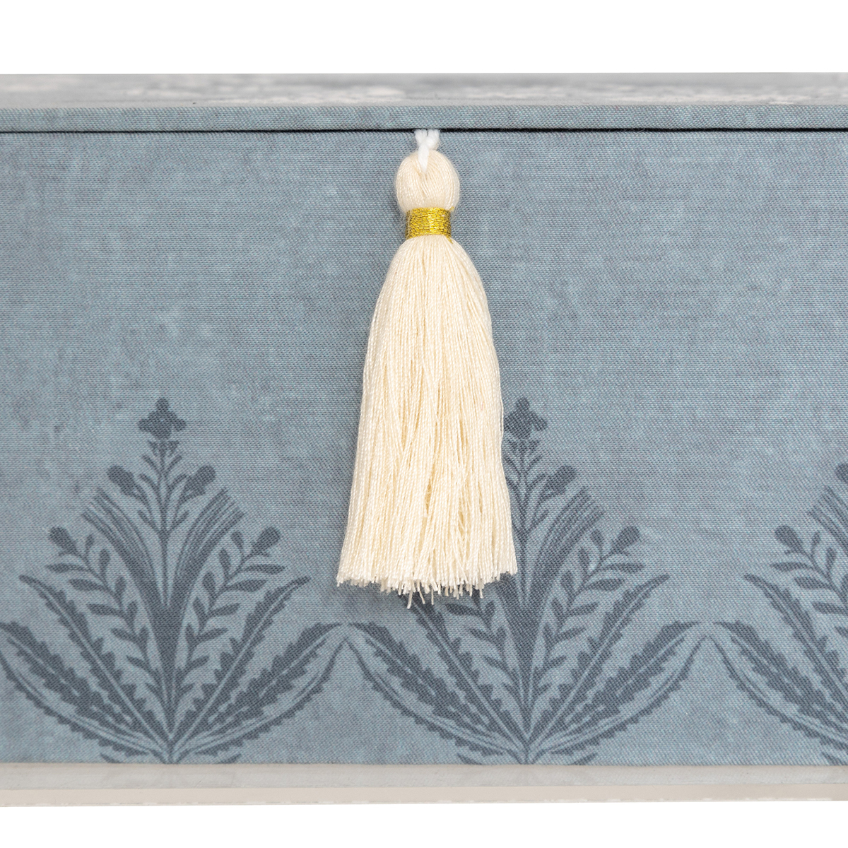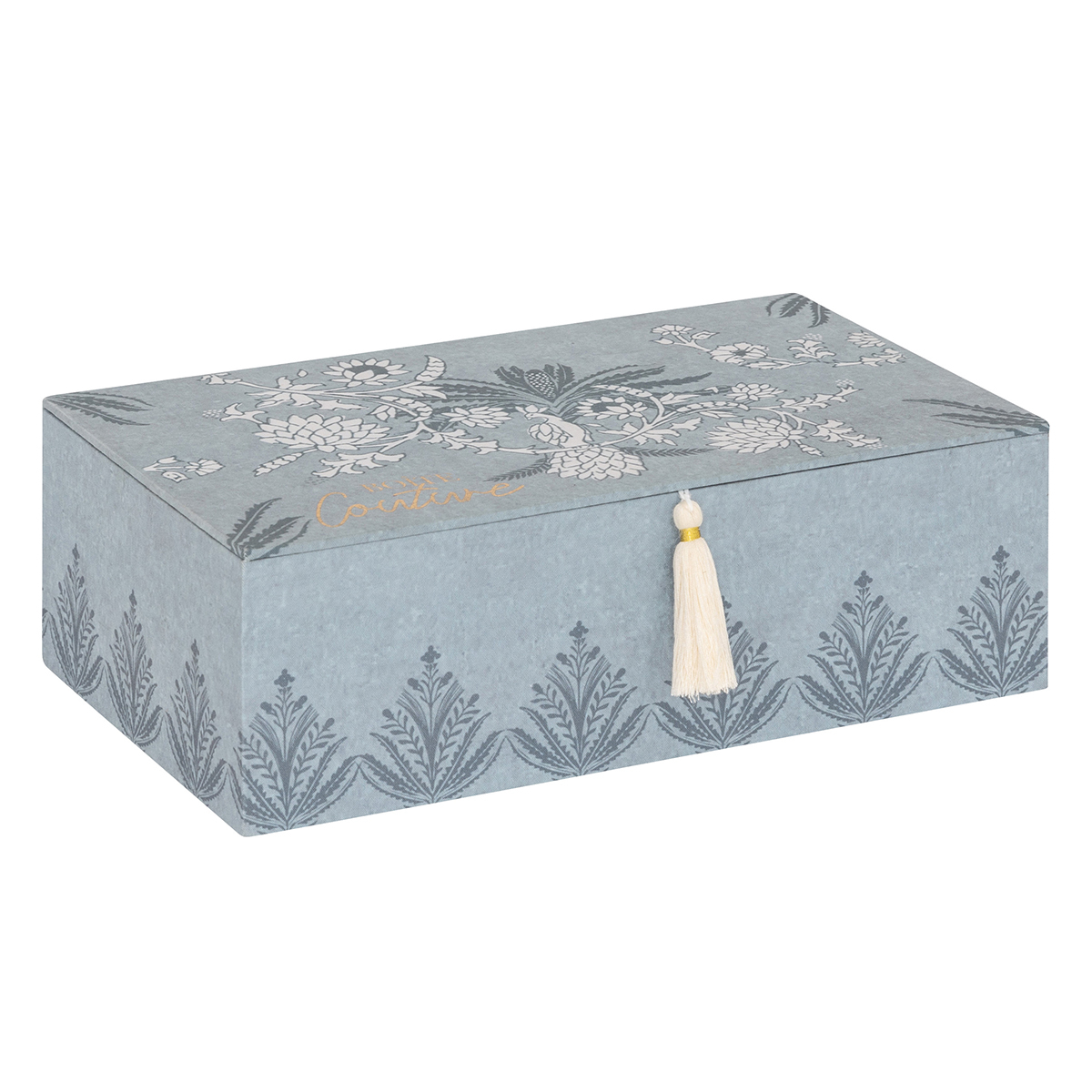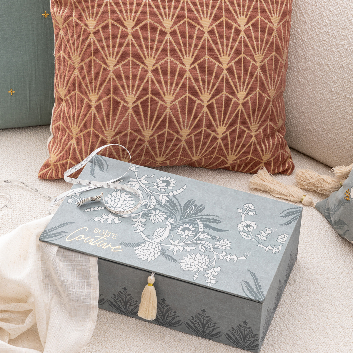 Κουτί για ραπτικά με vintage σχεδιασμό. Είναι κατασκευασμένο από ξύλο MDF_E1 σε γαλάζιο χρώμα με μπεζ εσωτερικό. Διαθέτει μια αφαιρούμενη θήκη με 5 χωρίσματα και από κάτω 1 ενιαίο χώρο. Ιδανικό για να είναι πάντα τακτοποιημένα και οργανωμένα τα ραφτικά σας.