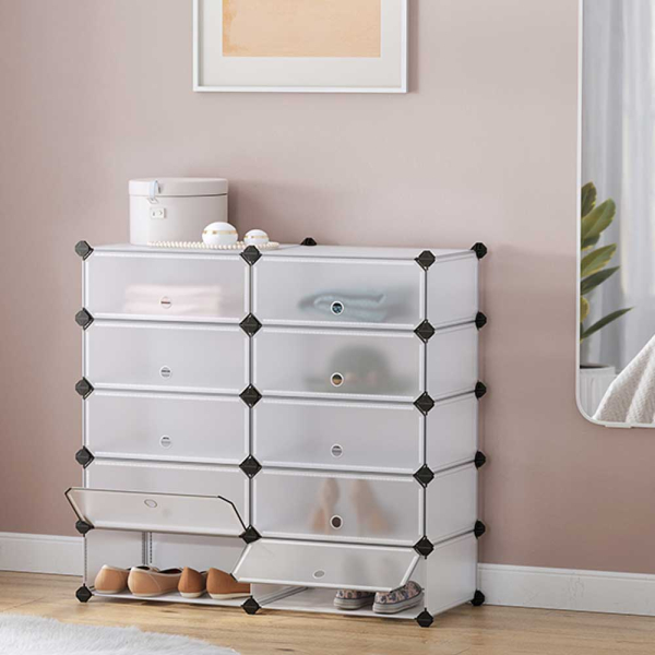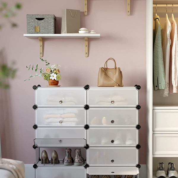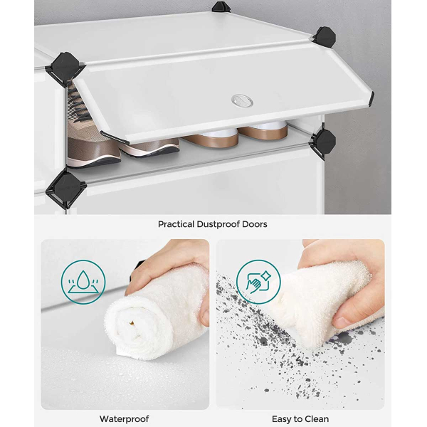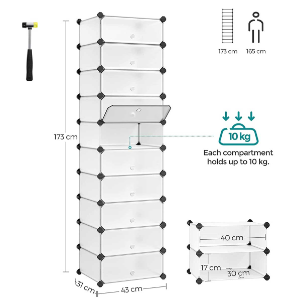 Παπουτσοθήκη 10 θέσεων από την εταιρεία Vasagle. Κατασκευασμένη από διάφανο πλαστικό υλικό. Μπορεί να χωρέσει 10 ζευγάρια ογκώδη παπούτσια ή αν είναι πιο λεπτά μπορεί να χωρέσει έως 2 ζευγη ανα θέση, δηλαδη 20 ζευγάρια. Η συσκευασία περιλαμβάνει 10 πλαστικές επιφάνειες διαστάσεων 45εκ.Μx35εκ.Π., 20 πλαστικές επιφάνειες διαστάσεων 35εκ.Μx17εκ.Π., 12 πλαστικές επιφάνειες διαστάσεων 45εκ.Μx17εκ.Π., 10 πόρτες 45εκ.Μx17εκ.Π., 48 πλαστικοί σύνδεσμοι και ένα εργαλείο συναρμολόγησης. Η κάθε θέση έχει 30εκ.Μx40εκ.ΠΒx17εκ.Υ. Η παπουτσοθήκη είναι αδιάβροχη και καθαρίζεται εύκολα με ένα πανάκι. Μπορείτε να τις τοποθετήσετε όλες μαζί διαδοχικά ή ξεχωριστά. Μέγιστο Βάρος Αντοχής Για Κάθε Θέση 10 kg. *Το προϊόν έρχεται αμοντάριστο.*