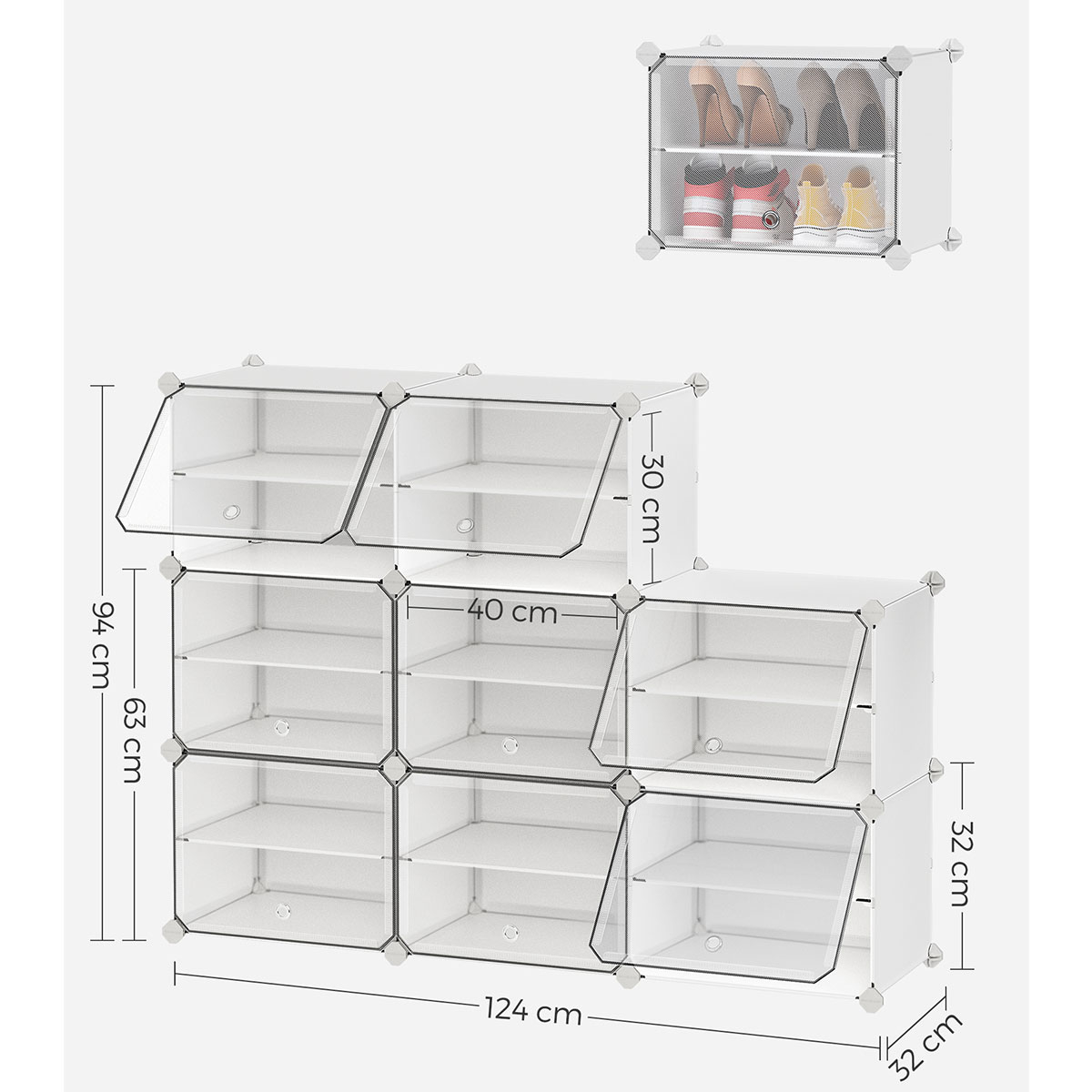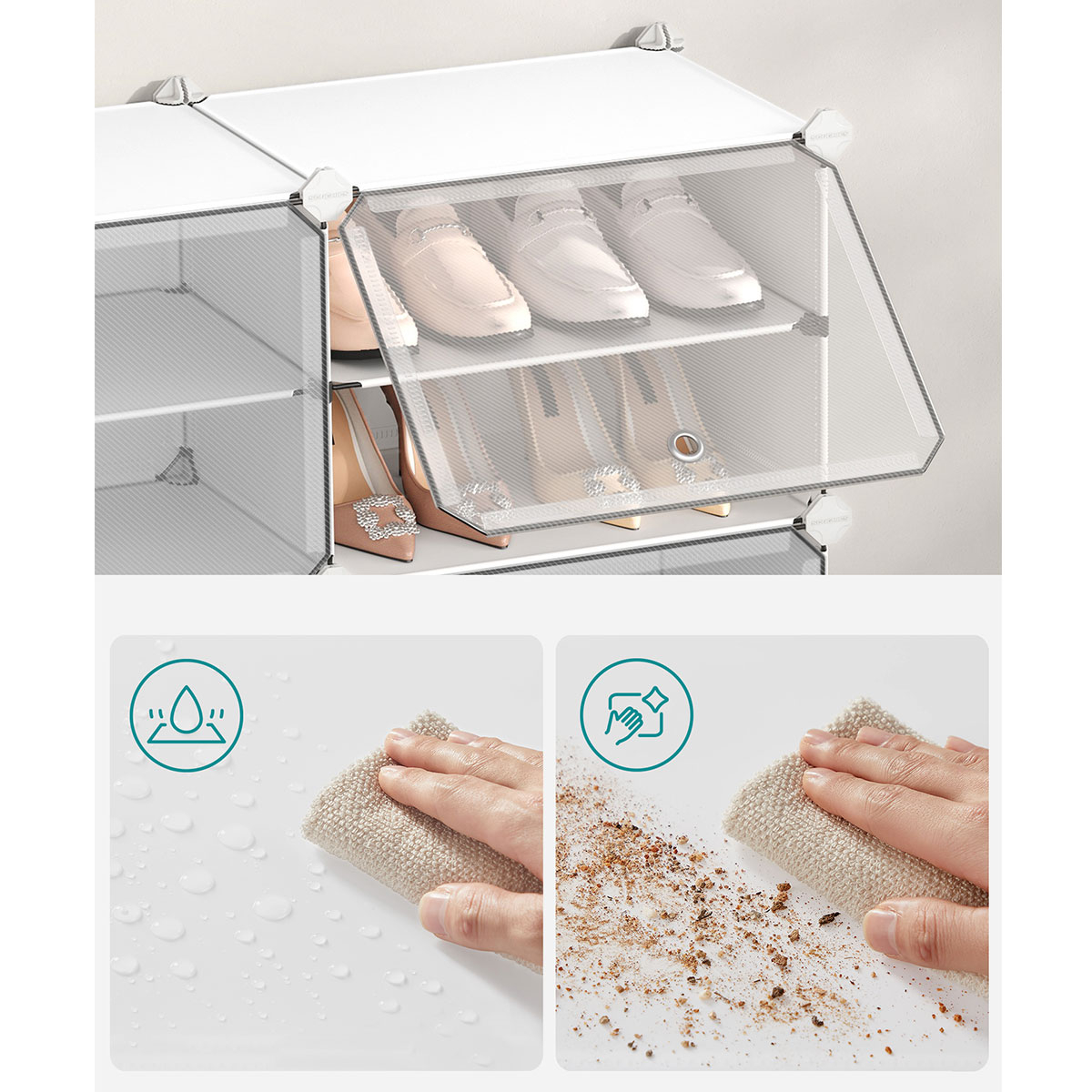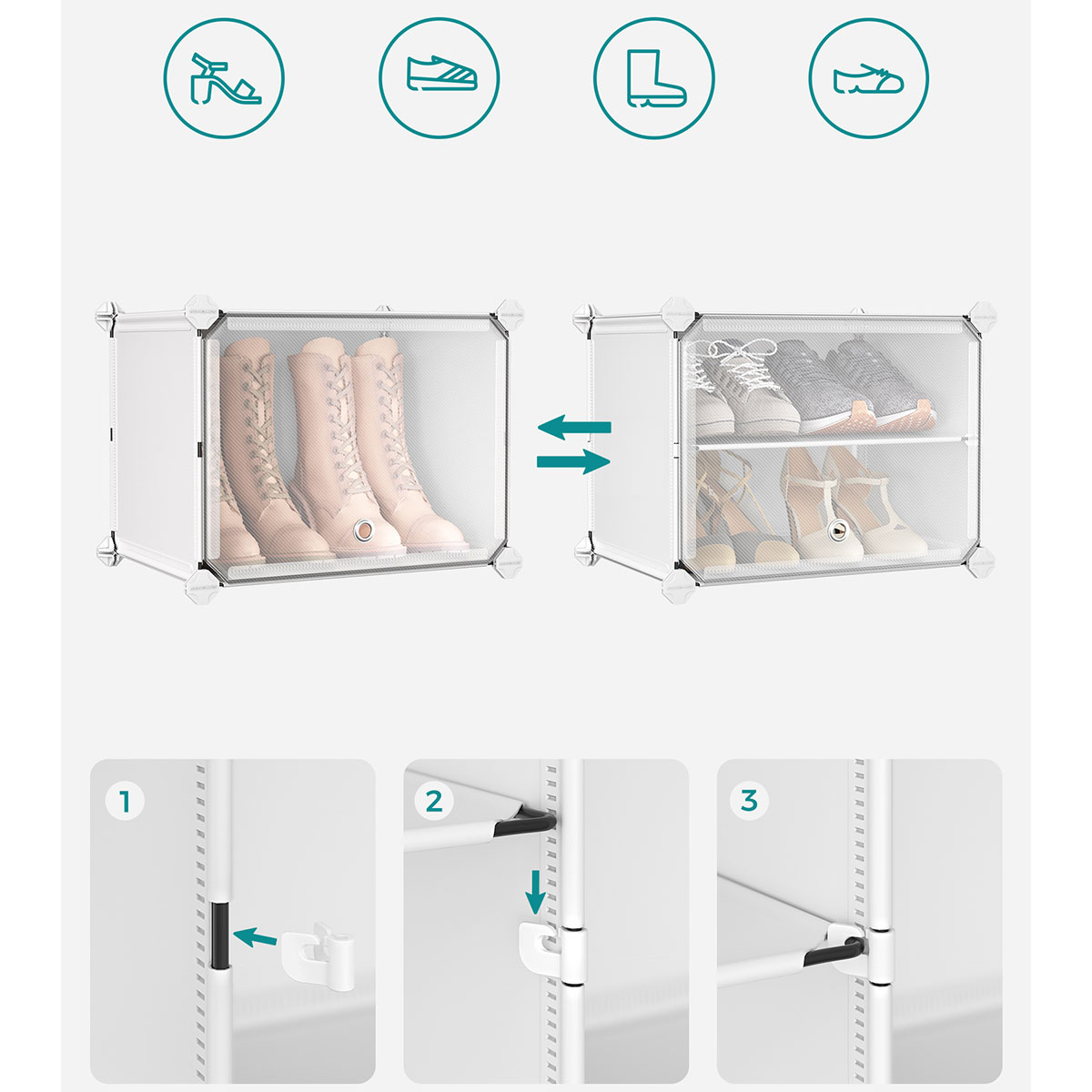 Στοιβαζόμενα κουτιά αποθήκευσης - παπουτσοθήκη από την εταιρεία Songmics. Αποτελείται από 8 κουτιά ιδανικά για να αποθηκεύεσετε παπούτσια ή ότι άλλο επιθυμείτε. Μπορείτε να στοιβάξετε το ένα κουτί πάνω στο άλλο ή το καθένα μεμονωμένα. Το προϊόν έρχεται αμοντάριστο.