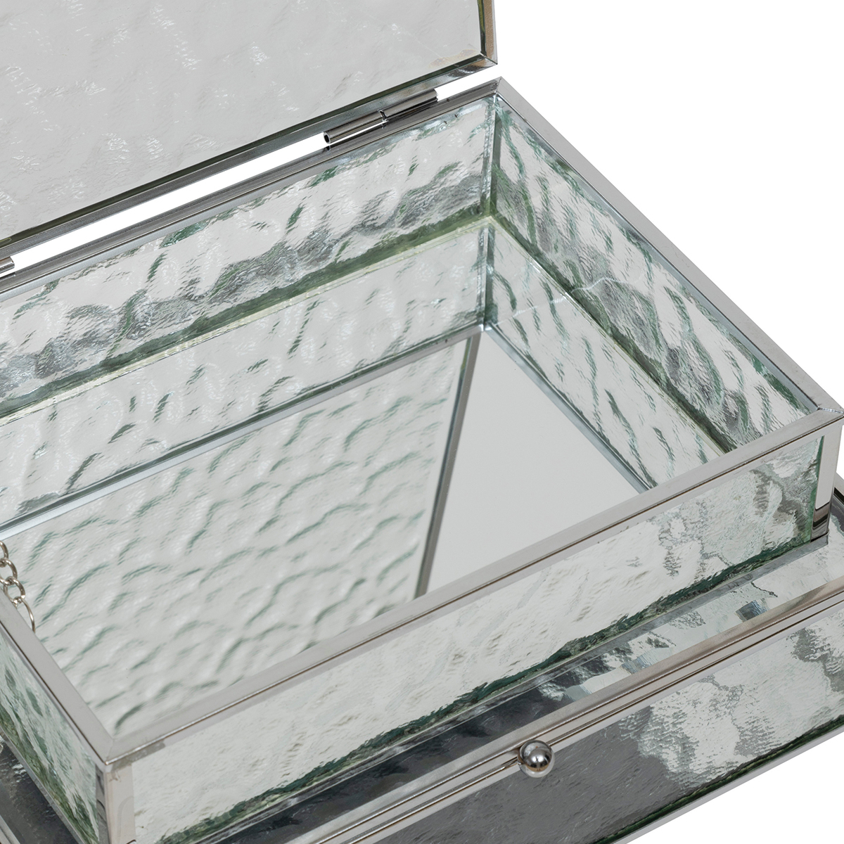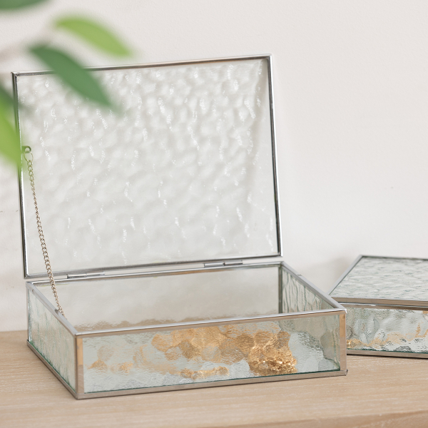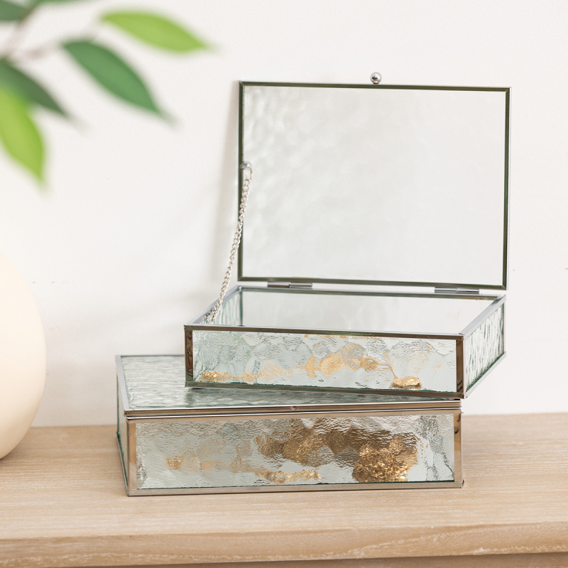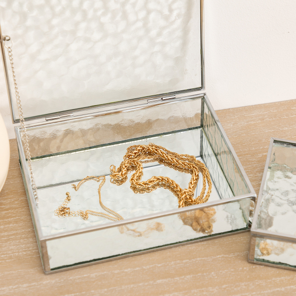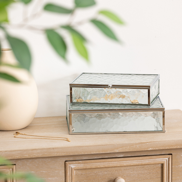 Κουτιά με καπάκι ιδανικά για να τακτοποιήσετε τα μικροπράγματα σας. Το σετ περιλαμβάνει 2 κουτιά διαφορετικών μεγεθών. Είναι κατασκευασμένα από θαμπό γυαλί με ασημί μεταλλικές λεπτομέρειες. Μπορούν να χρησιμοποιηθούν και ως μπιζουτιέρες για κολιέ, βραχιόλια, σκουλαρίκια και δαχτυλίδια.
