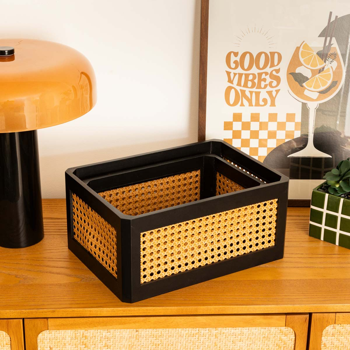 Στοιβαζόμενα κουτιά αποθήκευσης σε σετ με μοντέρνο ύφος. Είναι κατασκευασμένα από ξύλο MDF_E1 σε μπεζ και μαύρο χρώμα. Το σετ περιλαμβάνει 2 κουτιά διαφορετικών μεγεθών. Ιδανικά για το καθιστικό, το υπνοδωμάτιο ή οποιοδήποτε άλλο χώρο του σπιτιού έχει μικροπράγματα για τακτοποίηση.