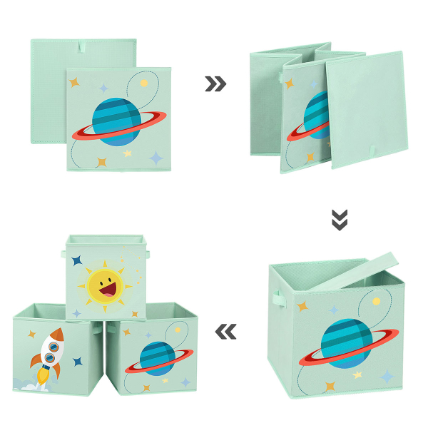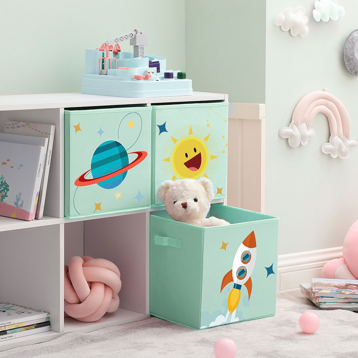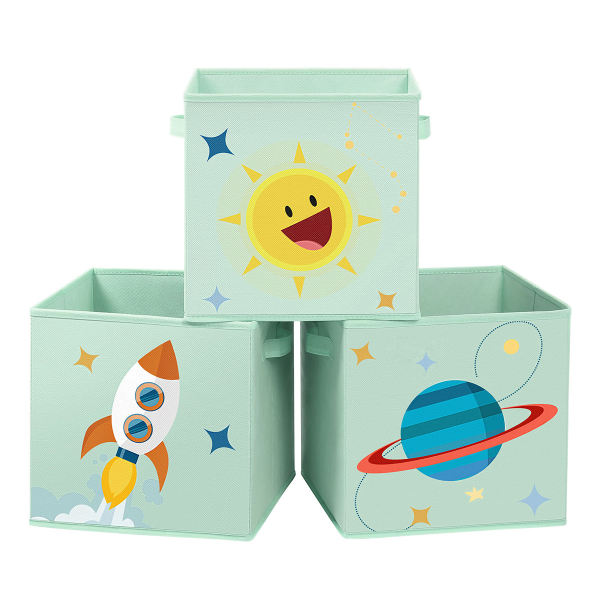Κουτιά αποθήκευσης σε σετ 3 τεμαχίων από την εταιρεία Songmics. Είναι υφασμάτινα σε βεραμάν χρώμα και έχουν σχέδια με το διάστημα. Εσωτερικά έχουν χαρτόνι για να διατηρούν το σχήμα τους και διαθέτουν λαβές για εύκολη μεταφορά. Ιδανικά κουτιά που θα χαρίσουν ένα παιχνιδιάρικο ύφος στο δωμάτιο του παιδιού σας ενώ παράλληλα θα είναι πάντα τακτοποιημένο.