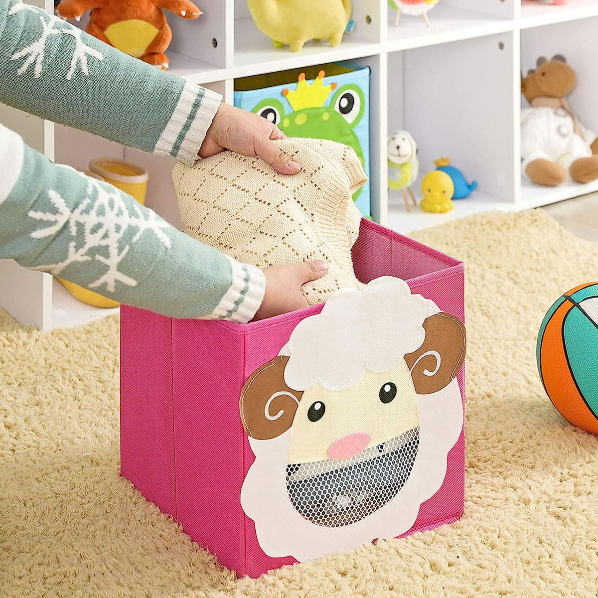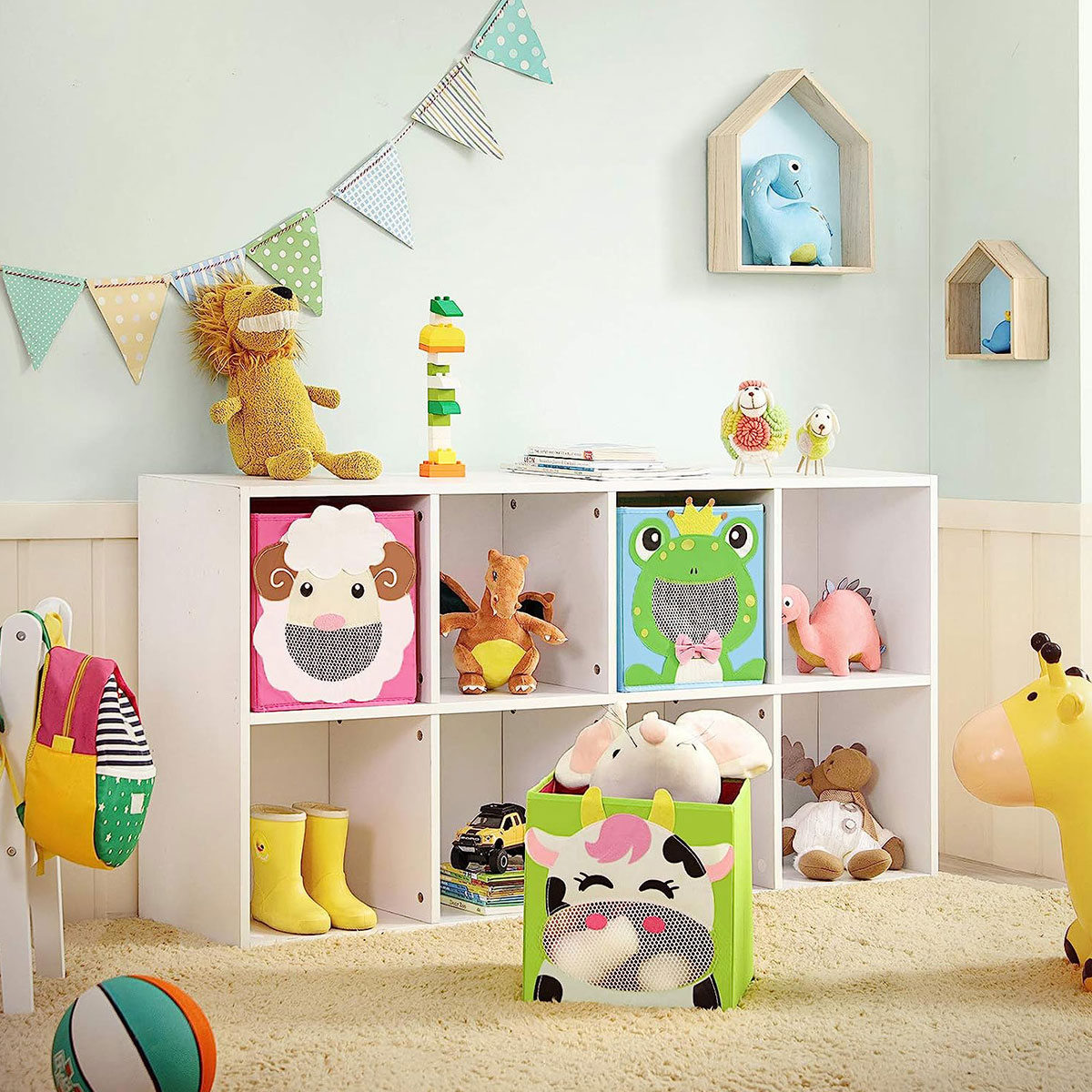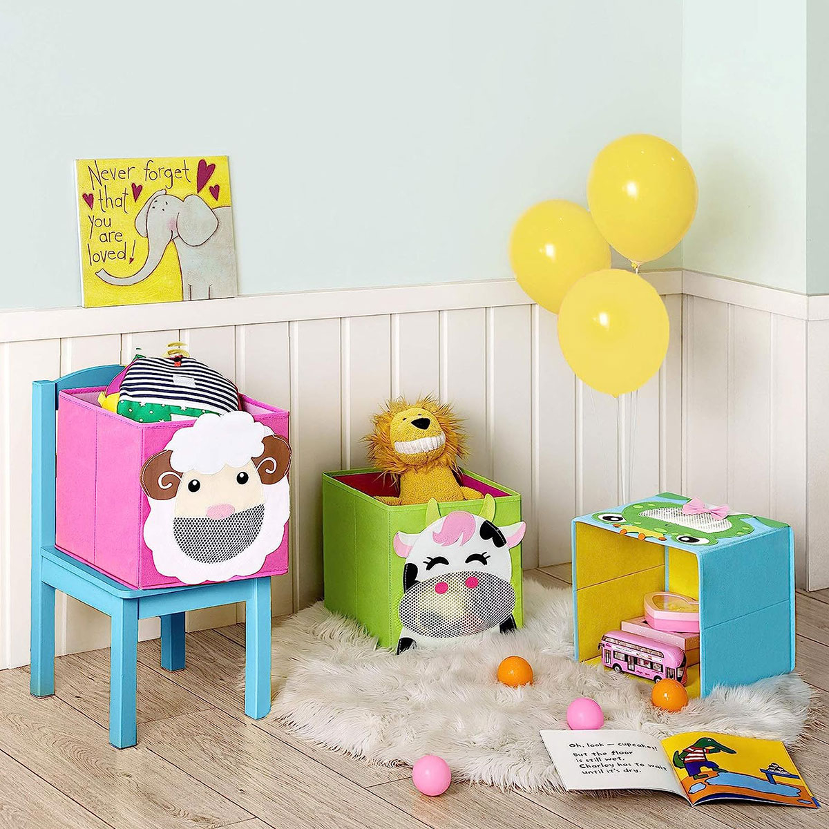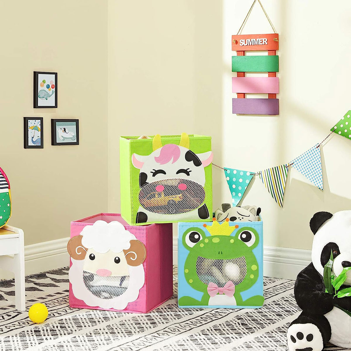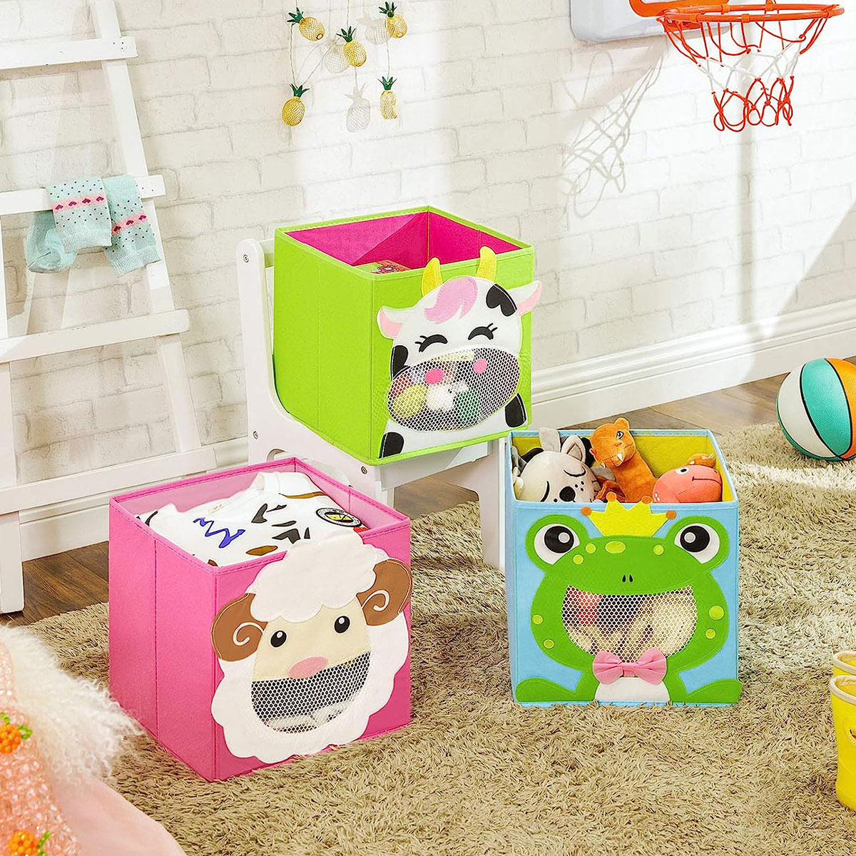 Κουτιά αποθήκευσης σε σετ 3 τεμαχίων από την εταιρεία Songmics. Είναι υφασμάτινα σε φούξια, γαλάζιο και πράσινο χρώμα με πολύχρωμες λεπτομέρειες και σχέδιο ζωάκια. Εσωτερικά έχουν χαρτόνι για να διατηρούν το σχήμα τους. Ιδανικά κουτιά που θα χαρίσουν ένα παιχνιδιάρικο ύφος στο δωμάτιο του παιδιού σας ενώ παράλληλα θα είναι πάντα τακτοποιημένο.