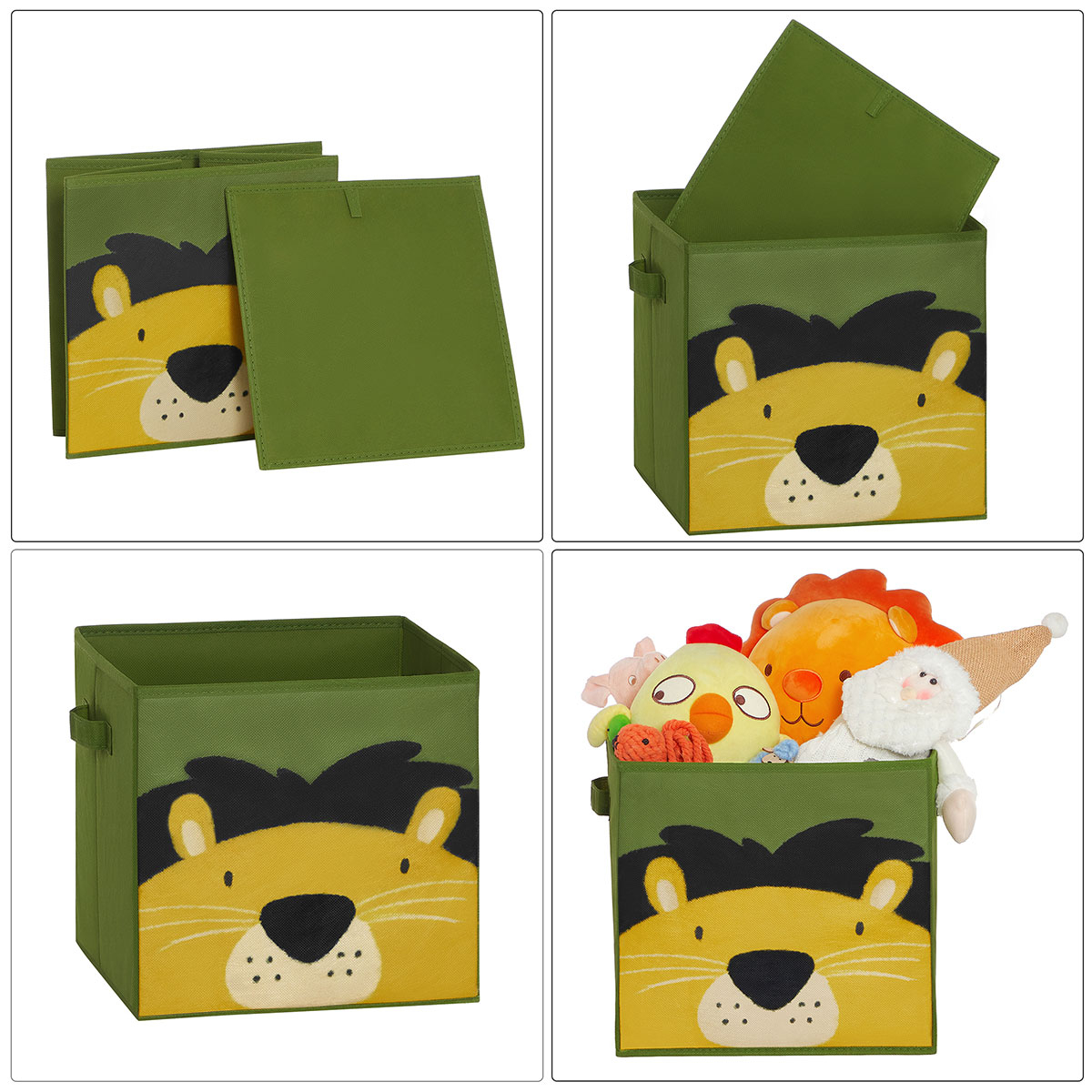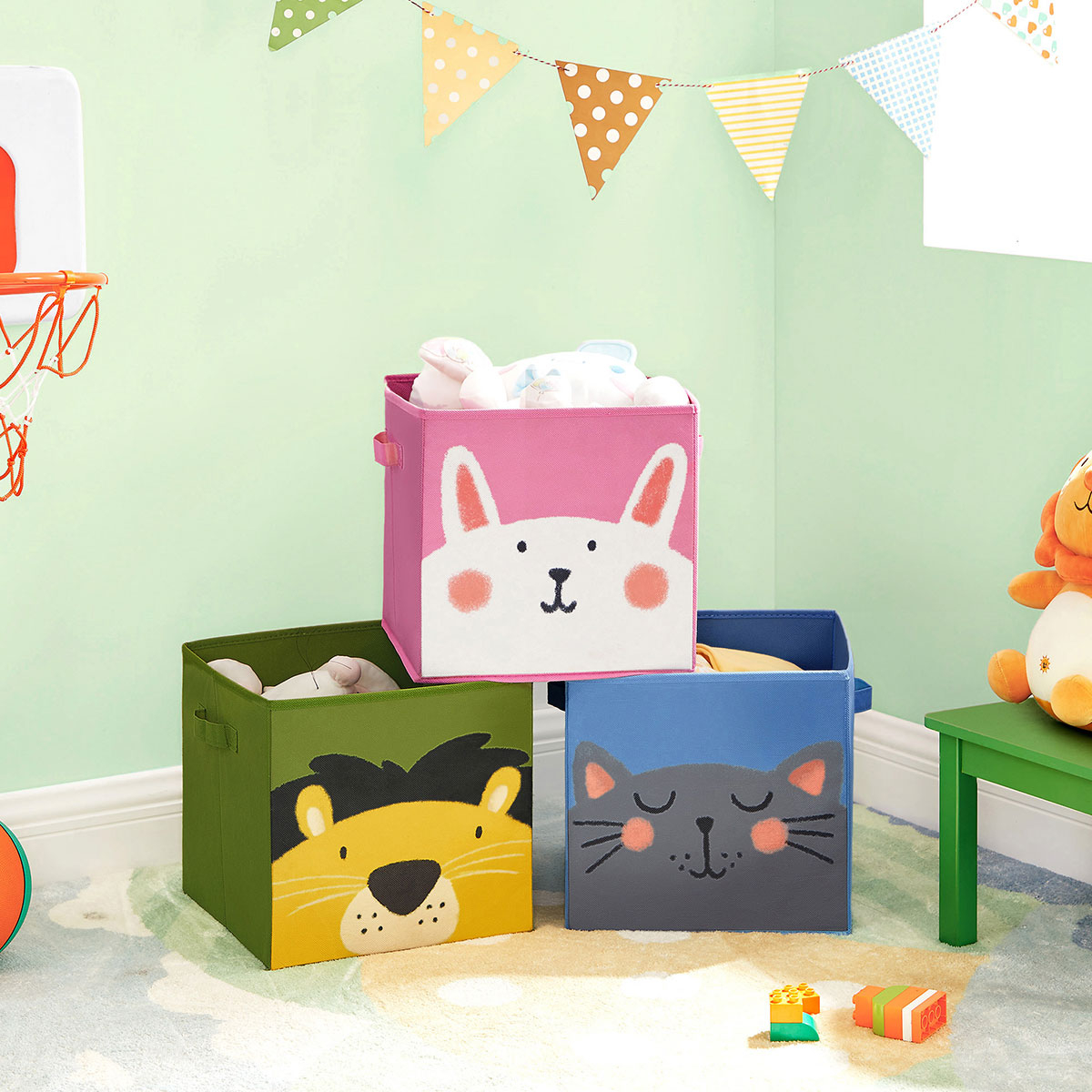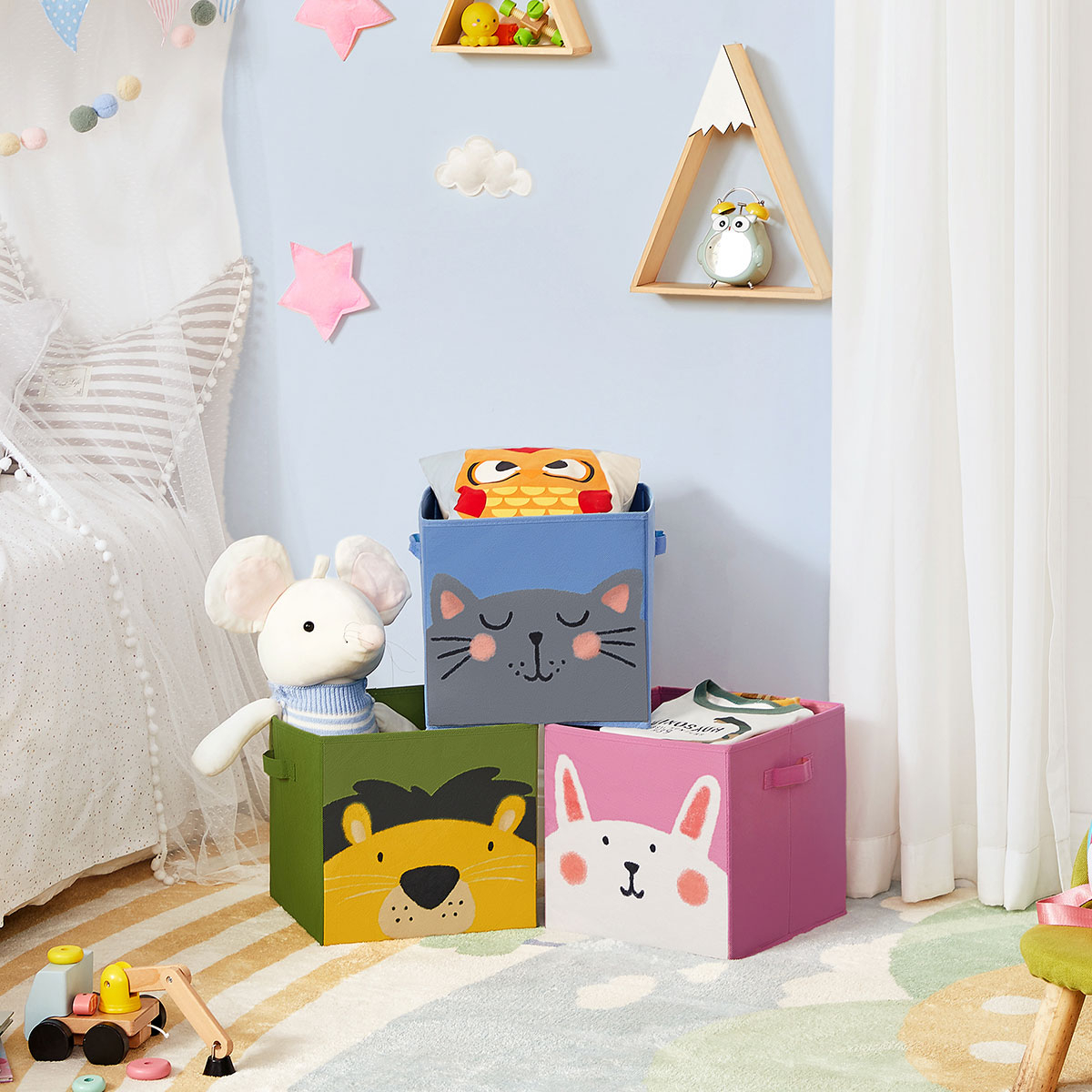 Κουτιά αποθήκευσης σε σετ 3 τεμαχίων από την εταιρεία Songmics. Είναι υφασμάτινα σε μπλε, χακί και φούξια χρώμα με πολύχρωμες λεπτομέρειες και έχουν σχέδια με ζωάκια. Εσωτερικά έχουν χαρτόνι για να διατηρούν το σχήμα τους και διαθέτουν λαβές για εύκολη μεταφορά. Ιδανικά κουτιά που θα χαρίσουν ένα παιχνιδιάρικο ύφος στο δωμάτιο του παιδιού σας ενώ παράλληλα θα είναι πάντα τακτοποιημένο.