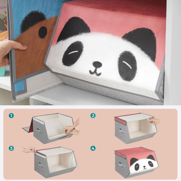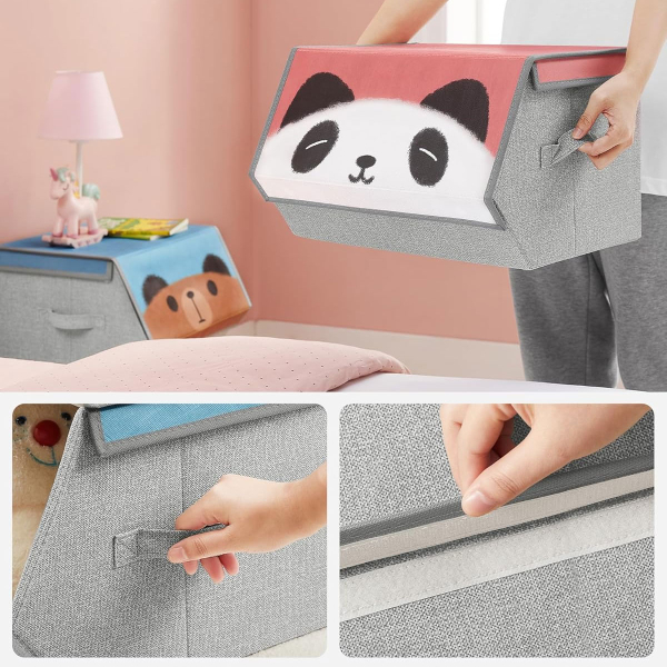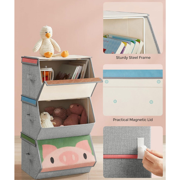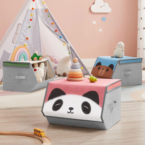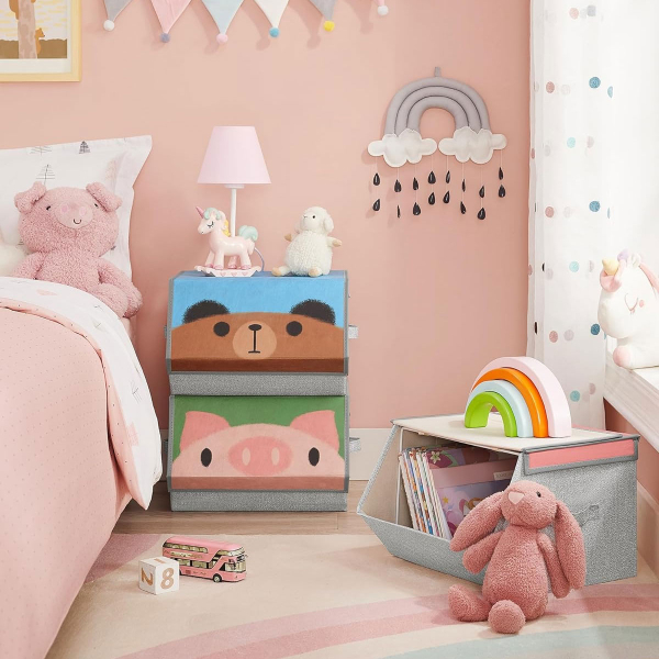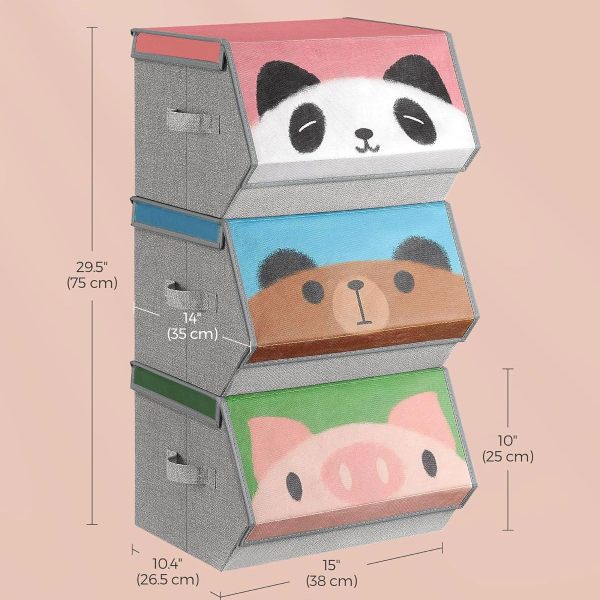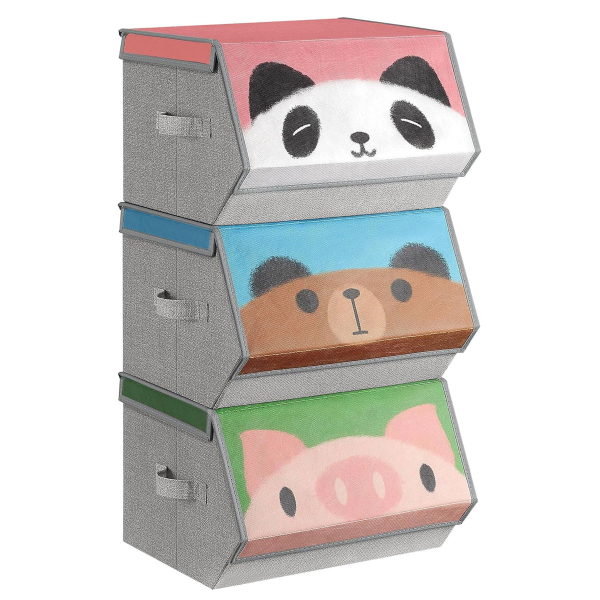 Κουτιά αποθήκευσης σε σετ από την εταιρεία Songmics. Το σετ περιλαμβάνει 3 κουτιά αποθήκευσης τα οποία είναι κατασκευασμένα από γκρι ύφασμα με πολύχρωμο σχέδιο ζωάκι και έχουν μεταλλικό σκελετό. Το ύψος τους είναι ιδανικό αφού τα καθιστά εύκολα προσβάσιμα στα παιδιά ώστε να μπορεί να μαζεύει μόνο του τα παιχνίδια του, τα αξεσουάρ ή τα βιβλία του. Μπορείτε να τα χρησιμοποιήσετε μεμονωμένα ή το ένα πάνω στο άλλο. Διαθέτουν λαβές στο πλάι για εύκολη μεταφορά. Ιδανικά για να οργανώσετε τον χώρο του παιδικού ή βρεφικού δωματίου. Μέγιστο βάρος αντοχής ανά κουτί: 2kg. *Το προϊόν έρχεται αμοντάριστο και συναρμολογείται βάσει οδηγιών.*