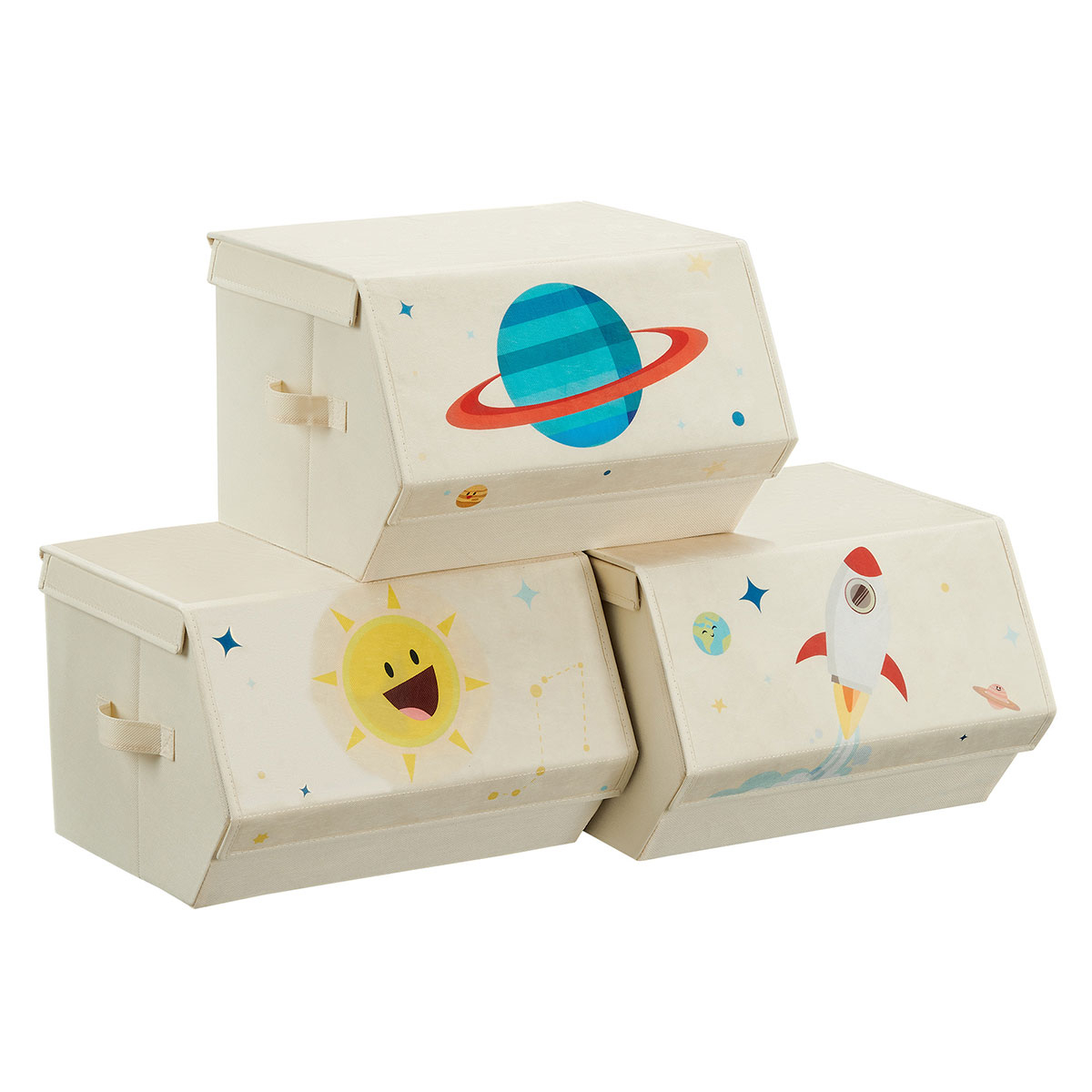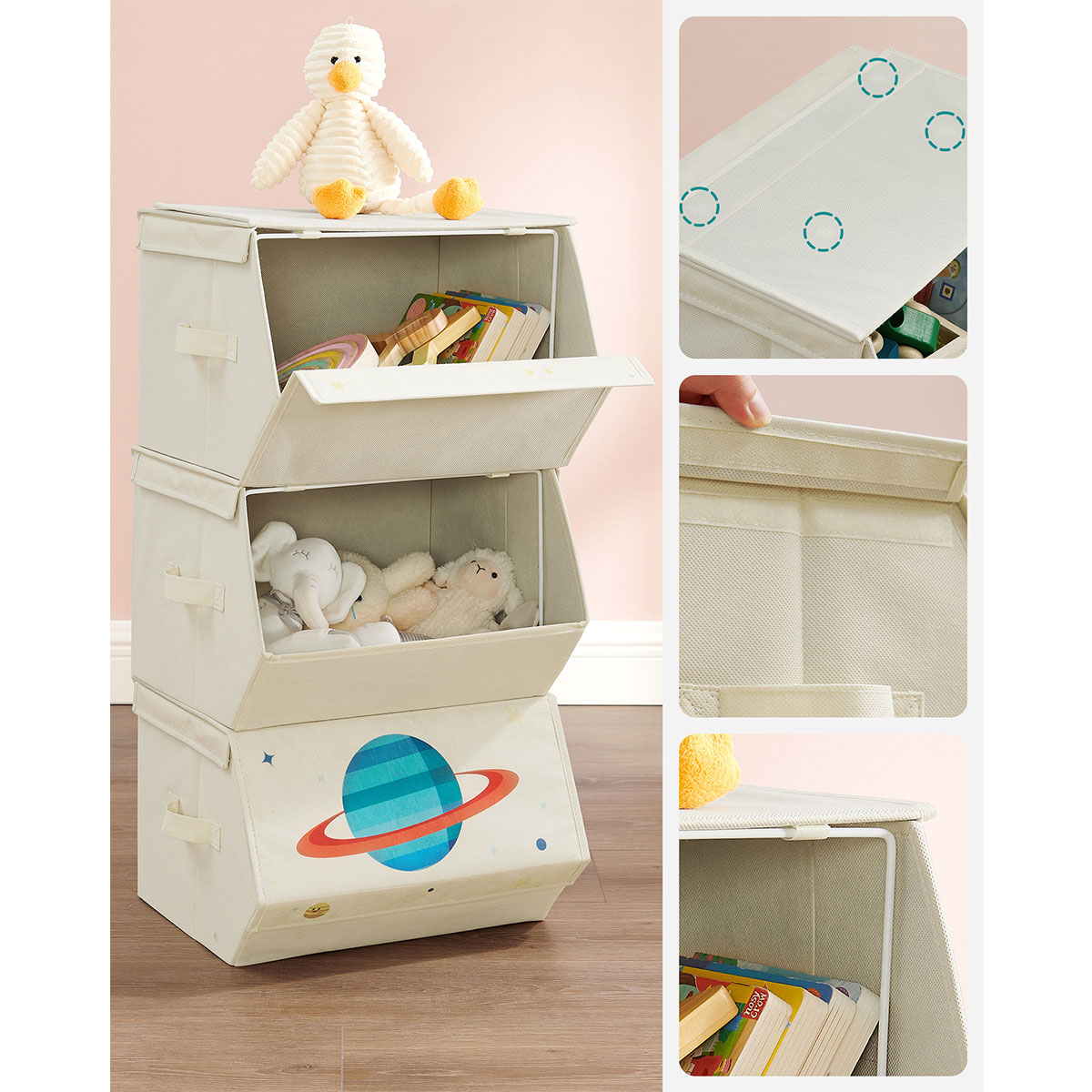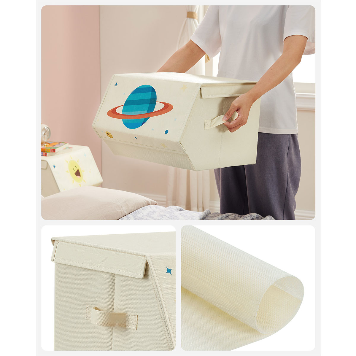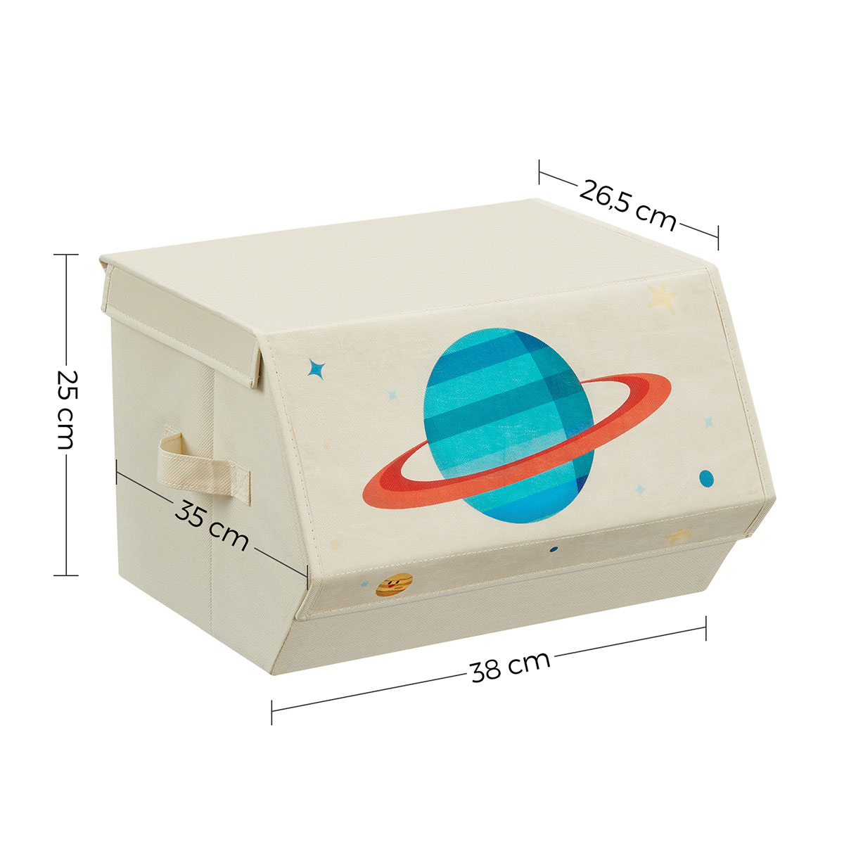Κουτιά αποθήκευσης σε σετ από την εταιρεία Songmics. Το σετ περιλαμβάνει 3 κουτιά αποθήκευσης τα οποία είναι κατασκευασμένα από εκρού ύφασμα με πολύχρωμο σχέδιο με το διάστημα. Εσωτερικά έχουν χαρτόνι για να διατηρούν τα σχήμα τους. Το ύψος τους είναι ιδανικό αφού τα καθιστά εύκολα προσβάσιμα στα παιδιά ώστε να μπορεί να μαζεύει μόνο του τα παιχνίδια του, τα αξεσουάρ ή τα βιβλία του. Μπορείτε να τα χρησιμοποιήσετε μεμονωμένα ή το ένα πάνω στο άλλο. Διαθέτουν λαβές στο πλάι για εύκολη μεταφορά και κλείνουν με καπάκι. Ιδανικά για να οργανώσετε τον χώρο του παιδικού ή βρεφικού δωματίου. Μέγιστο βάρος αντοχής ανά κουτί: 2kg. *Το προϊόν έρχεται αμοντάριστο και συναρμολογείται βάσει οδηγιών.*