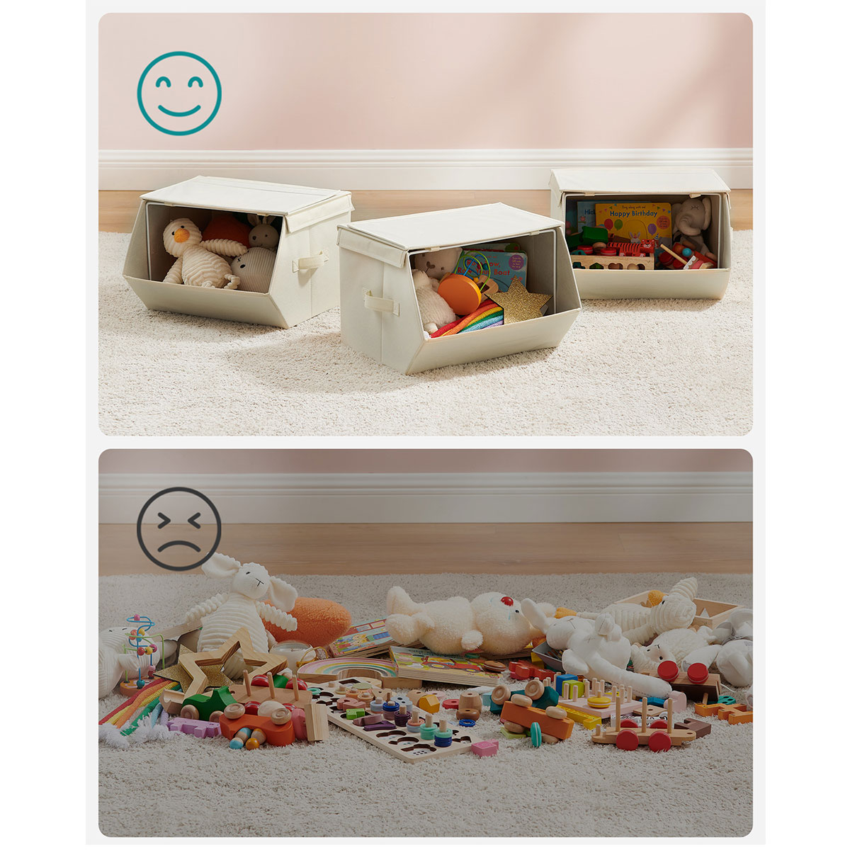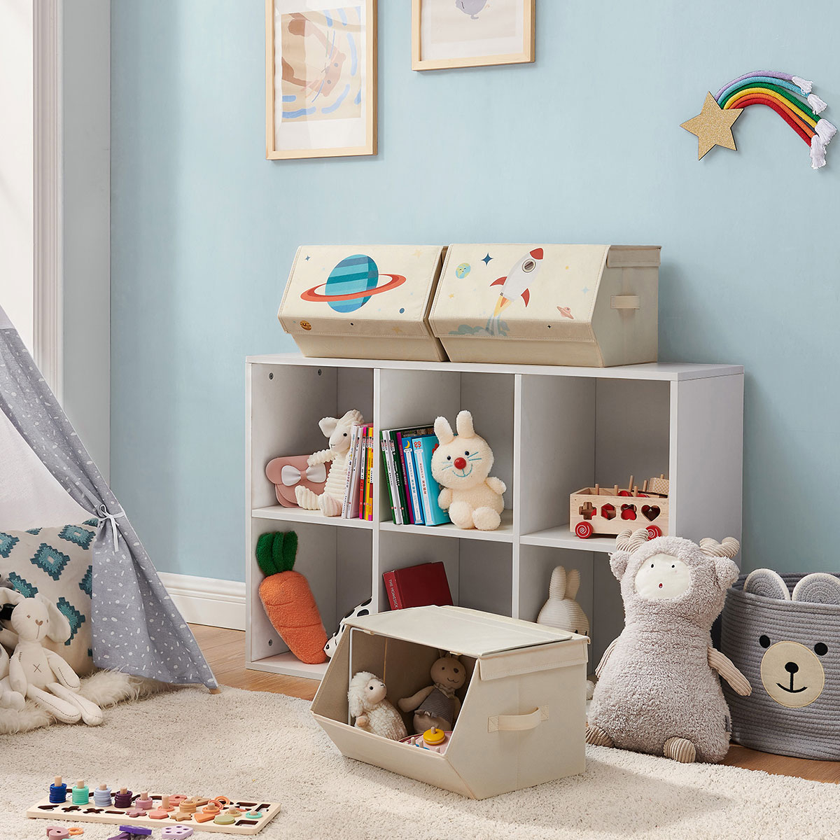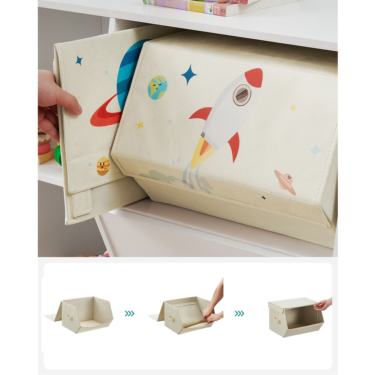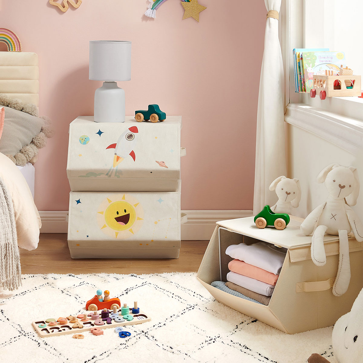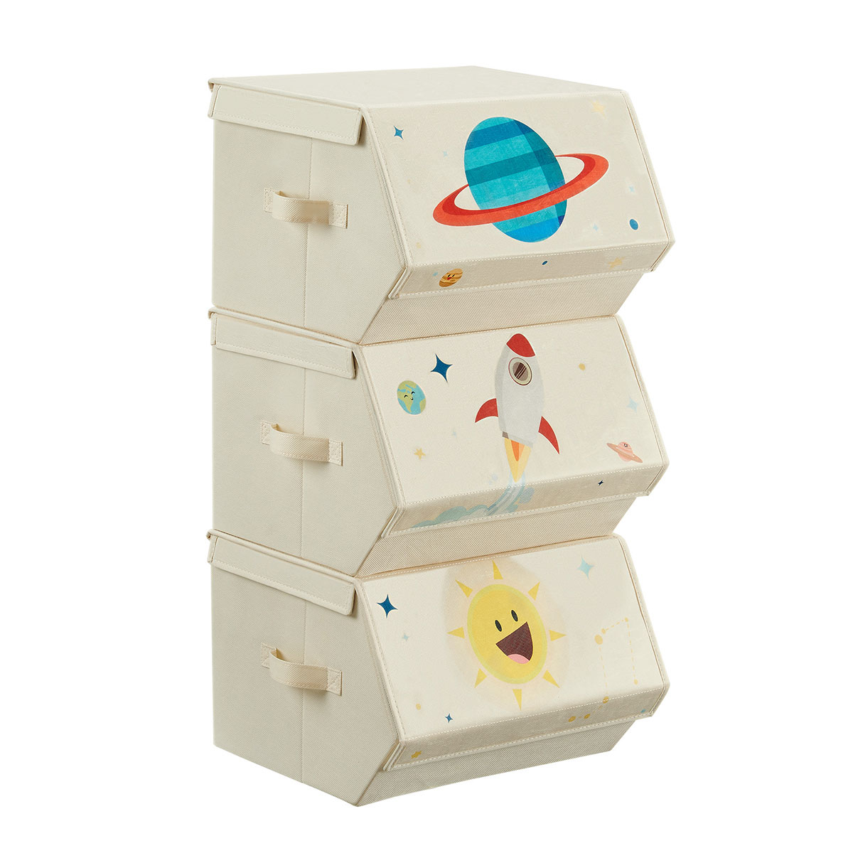 Κουτιά αποθήκευσης σε σετ από την εταιρεία Songmics. Το σετ περιλαμβάνει 3 κουτιά αποθήκευσης τα οποία είναι κατασκευασμένα από εκρού ύφασμα με πολύχρωμο σχέδιο με το διάστημα. Εσωτερικά έχουν χαρτόνι για να διατηρούν τα σχήμα τους. Το ύψος τους είναι ιδανικό αφού τα καθιστά εύκολα προσβάσιμα στα παιδιά ώστε να μπορεί να μαζεύει μόνο του τα παιχνίδια του, τα αξεσουάρ ή τα βιβλία του. Μπορείτε να τα χρησιμοποιήσετε μεμονωμένα ή το ένα πάνω στο άλλο. Διαθέτουν λαβές στο πλάι για εύκολη μεταφορά και κλείνουν με καπάκι. Ιδανικά για να οργανώσετε τον χώρο του παιδικού ή βρεφικού δωματίου. Μέγιστο βάρος αντοχής ανά κουτί: 2kg. *Το προϊόν έρχεται αμοντάριστο και συναρμολογείται βάσει οδηγιών.*
