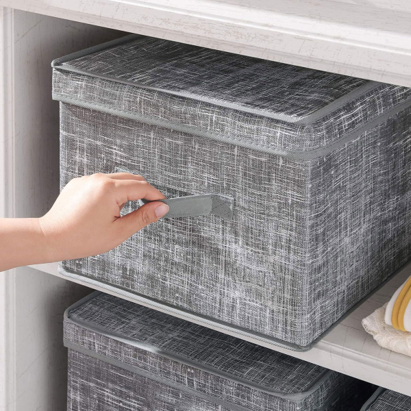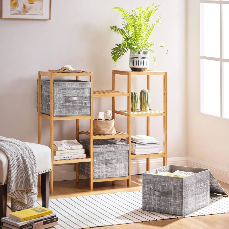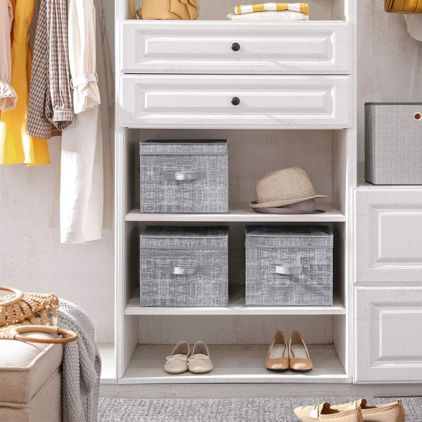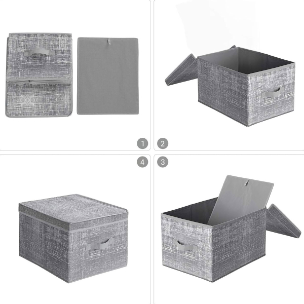 Κουτιά αποθήκευσης σε σετ 3 τεμαχίων από την εταιρεία Songmics. Είναι κατασκευασμένα εξωτερικά από γκρι συνθετικό ύφασμα non woven που αναπνέει και εσωτερικά από χαρτόνι για να κρατάνε το σχήμα τους. Διαθέτουν καπάκια και μπορείτε να τα χρησιμοποιήσετε σαν αποθηκευτικό χώρο σε ράφια. Έχουν λαβές για εύκολη μεταφορά. Ιδανικά για να κρατήσουν οργανωμένα τα αντικείμενά σας δίνοντας παράλληλα μια μοντέρνα πινελιά στην διακόσμηση σας. Όταν δεν χρησιμοποιούνται, μπορούν να διπλωθούν και να αποθηκευτούν για εξοικονόμηση χώρου.