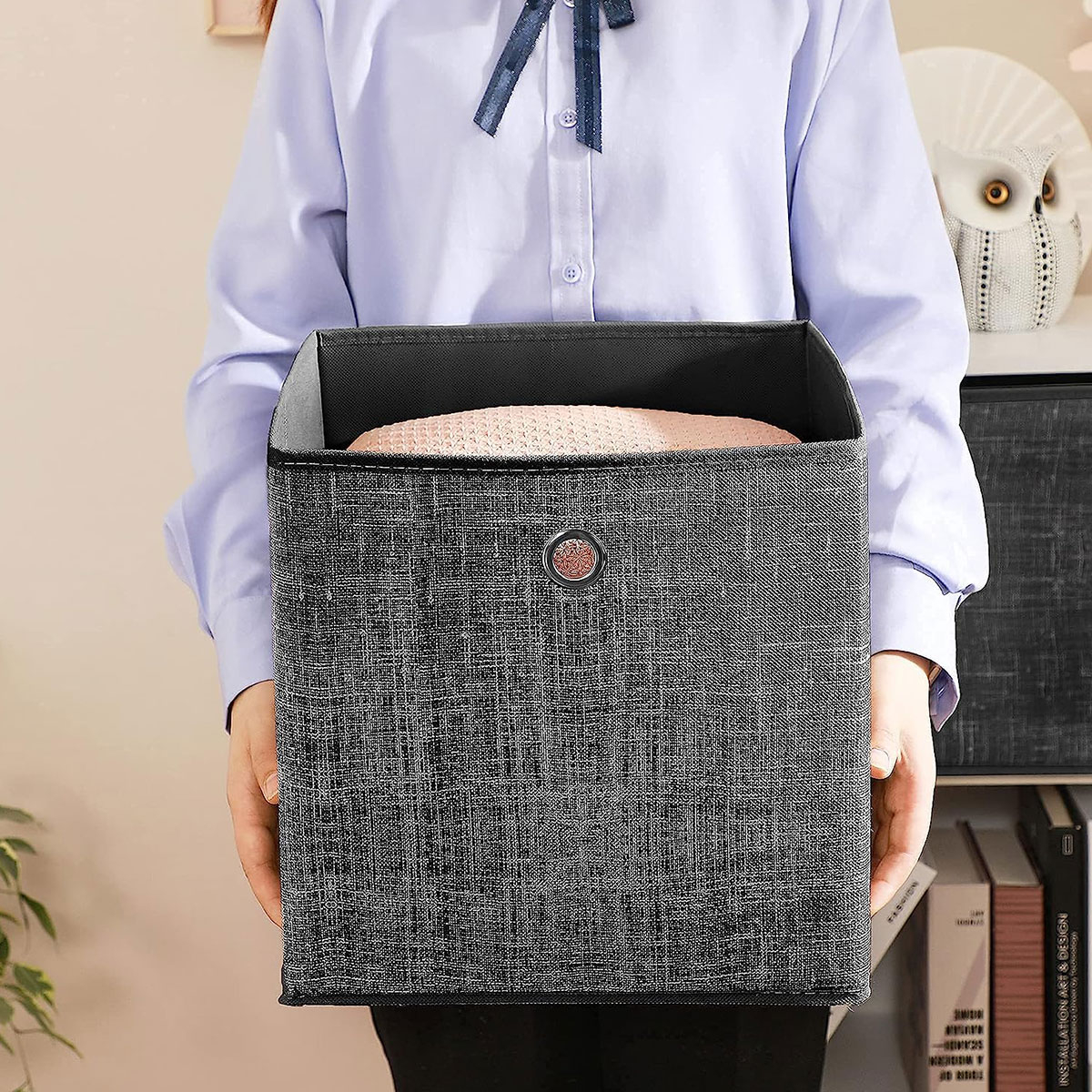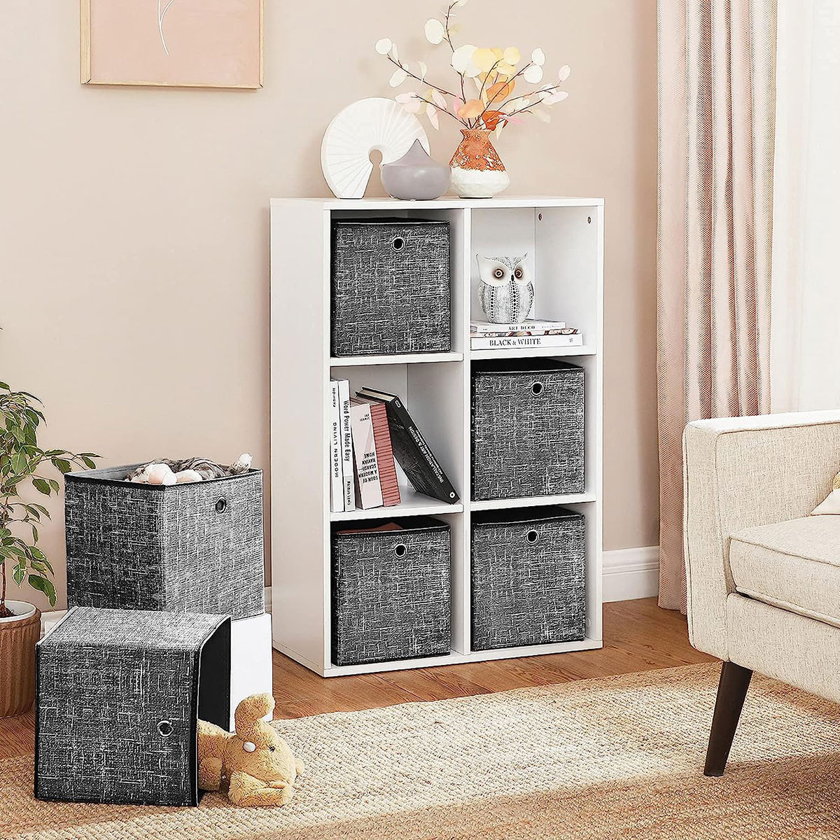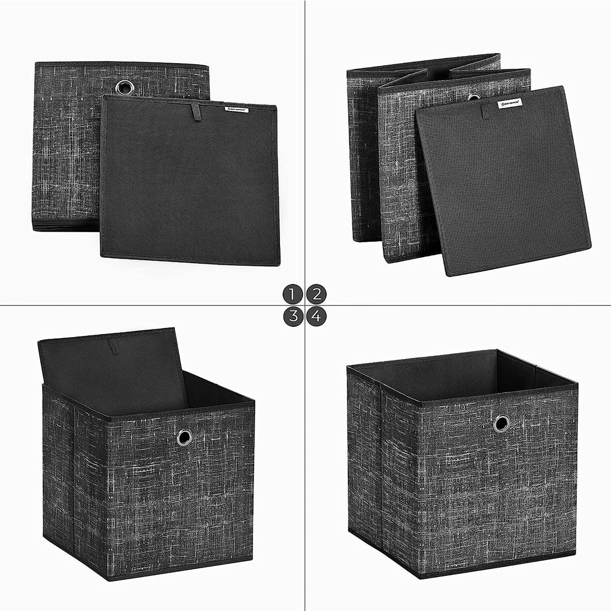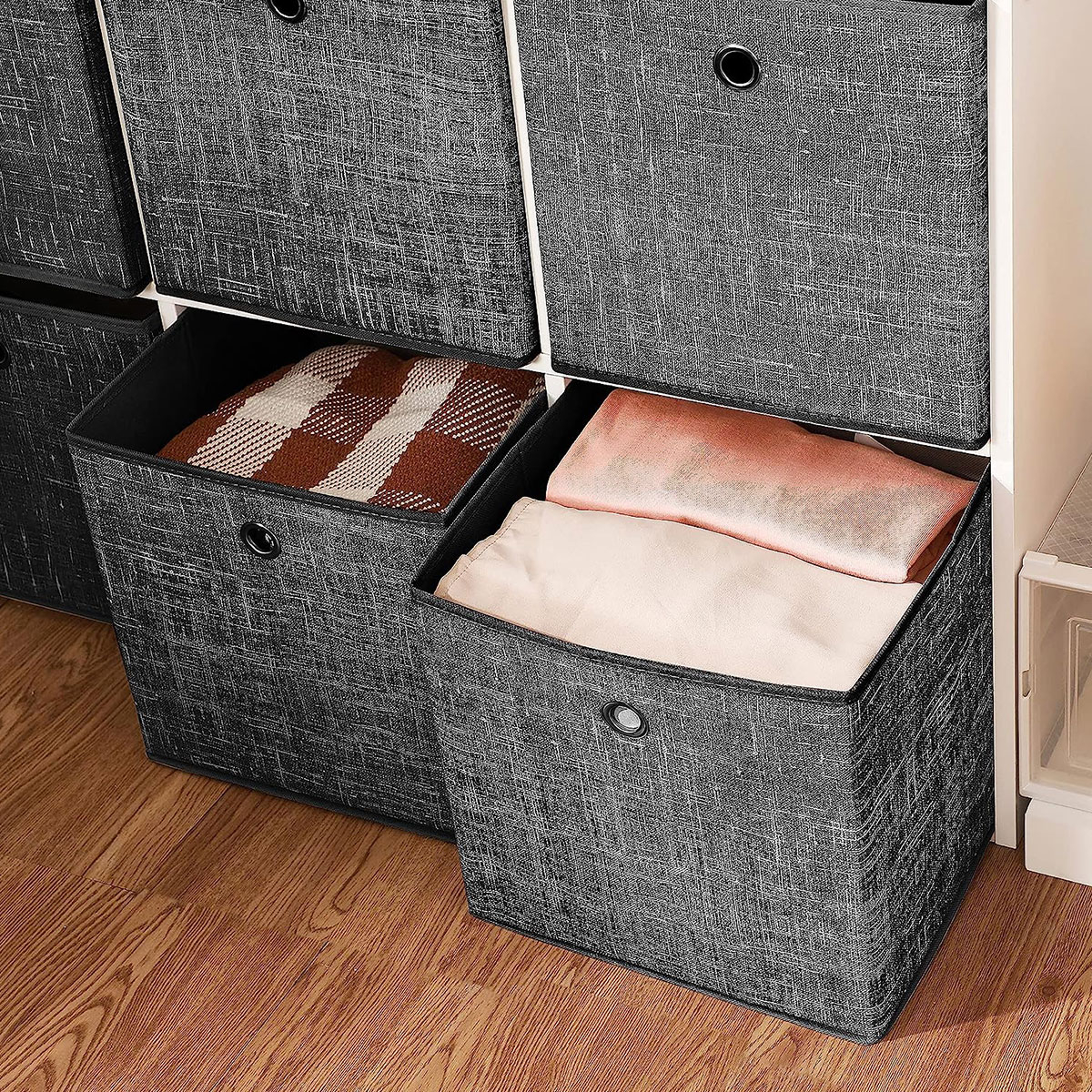 Κουτιά αποθήκευσης σε σετ 6 τεμαχίων με μίνιμαλ σχεδιασμό από την εταιρεία Songmics. Είναι κατασκευασμένα εξωτερικά από μαύρο συνθετικό ύφασμα non woven που αναπνέει και εσωτερικά από χαρτόνι για να κρατάνε το σχήμα τους. Μπορείτε να τα χρησιμοποιήσετε σαν αποθηκευτικό χώρο σε ράφια. Ιδανικά για να κρατήσουν οργανωμένα τα αντικείμενά σας, δίνοντας παράλληλα μια μοντέρνα πινελιά στην διακόσμηση σας. Όταν δεν χρησιμοποιούνται, μπορούν να διπλωθούν και να αποθηκευτούν για εξοικονόμηση χώρου. Μέγιστο βάρος αντοχής ανά κουτί: 5kg.