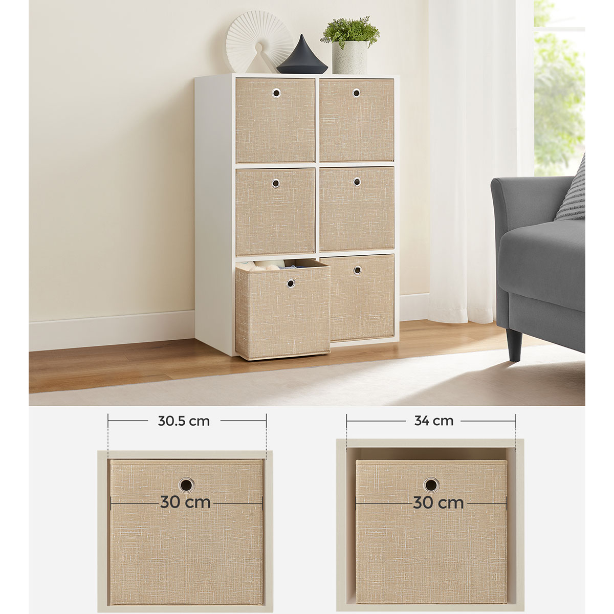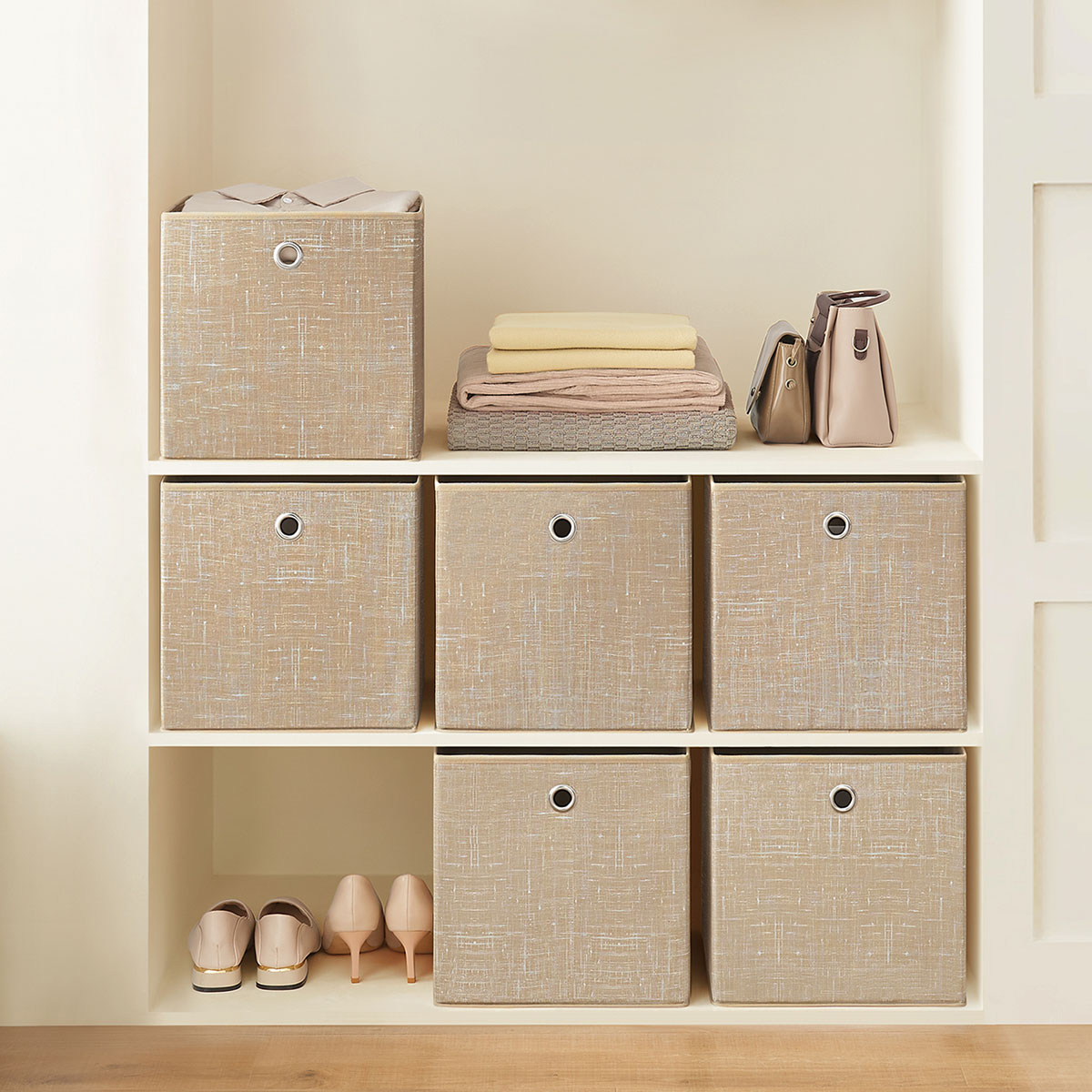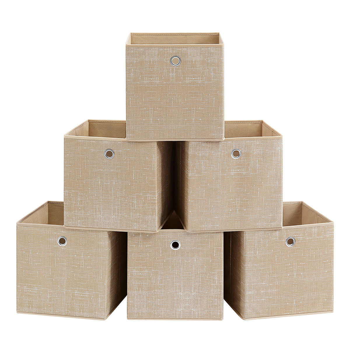 Κουτιά αποθήκευσης σε σετ 6 τεμαχίων με μίνιμαλ σχεδιασμό από την εταιρεία Songmics. Είναι κατασκευασμένα εξωτερικά από μπεζ συνθετικό ύφασμα non woven που αναπνέει και εσωτερικά από χαρτόνι για να κρατάνε το σχήμα τους. Μπορείτε να τα χρησιμοποιήσετε σαν αποθηκευτικό χώρο σε ράφια. Ιδανικά για να κρατήσουν οργανωμένα τα αντικείμενά σας, δίνοντας παράλληλα μια μοντέρνα πινελιά στην διακόσμηση σας. Όταν δεν χρησιμοποιούνται, μπορούν να διπλωθούν και να αποθηκευτούν για εξοικονόμηση χώρου. Μέγιστο βάρος αντοχής ανά κουτί: 5kg.