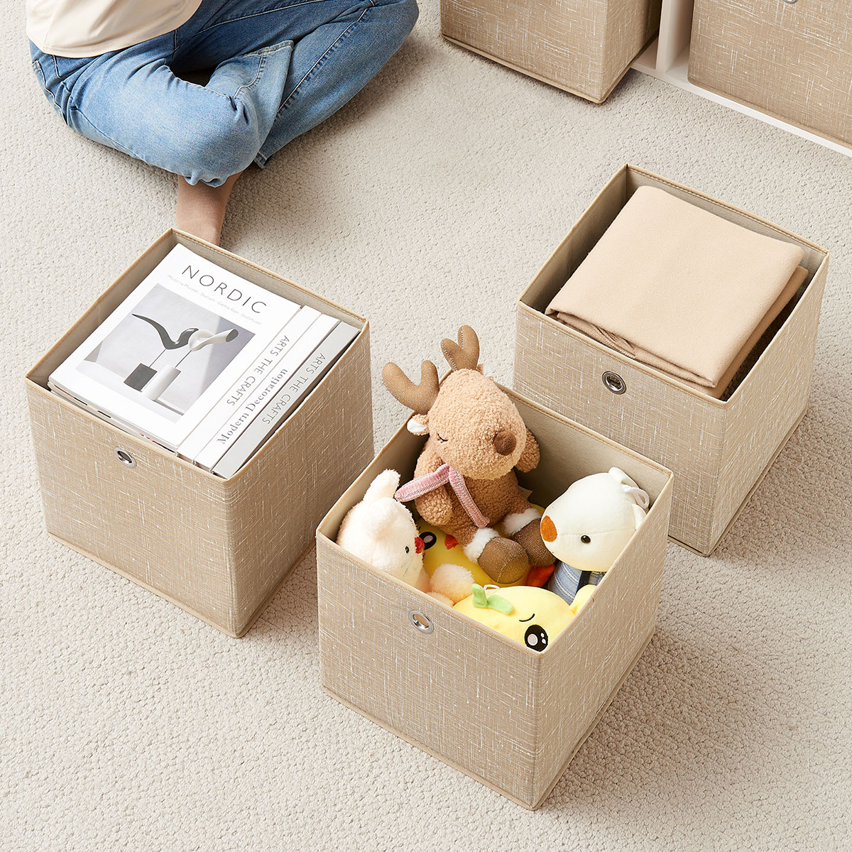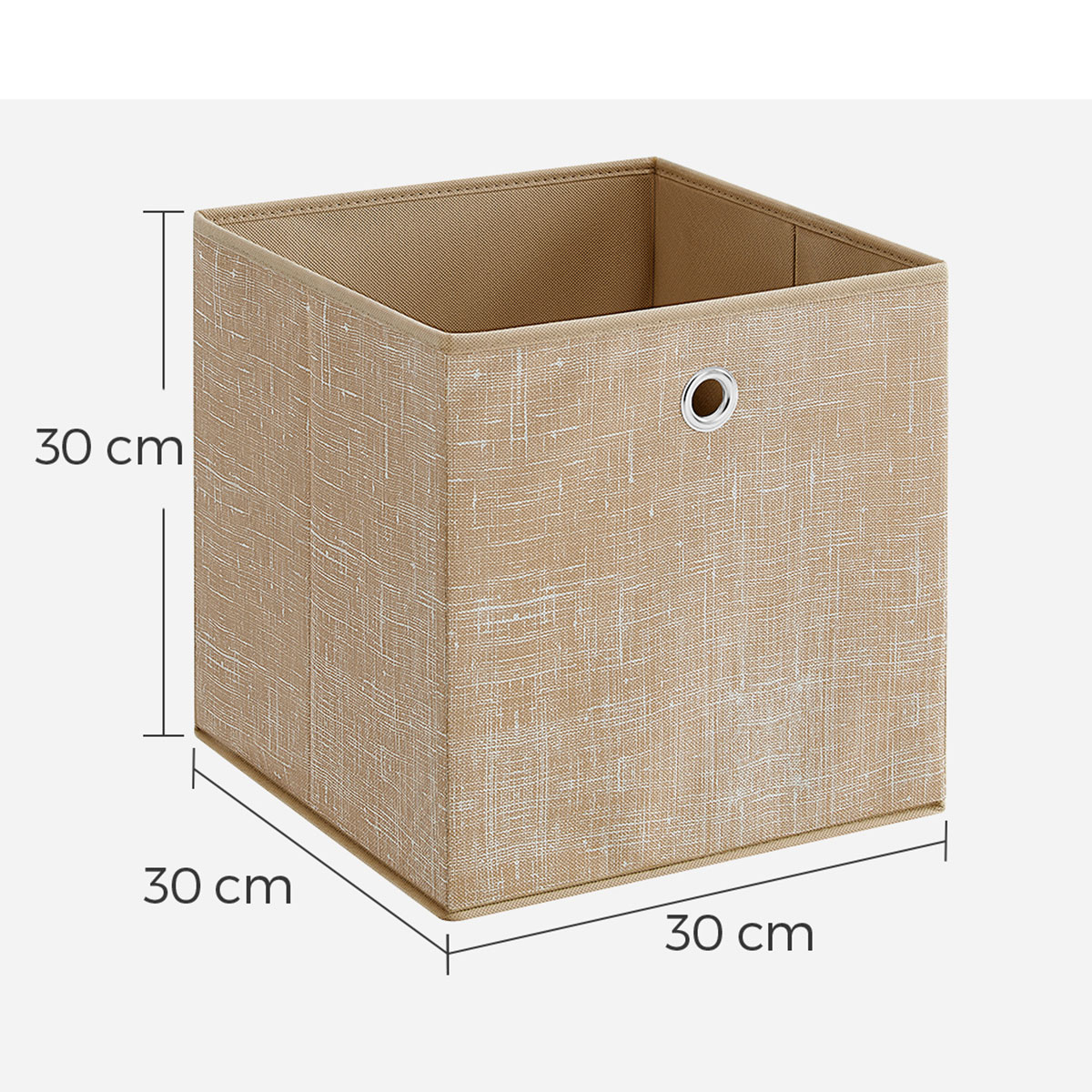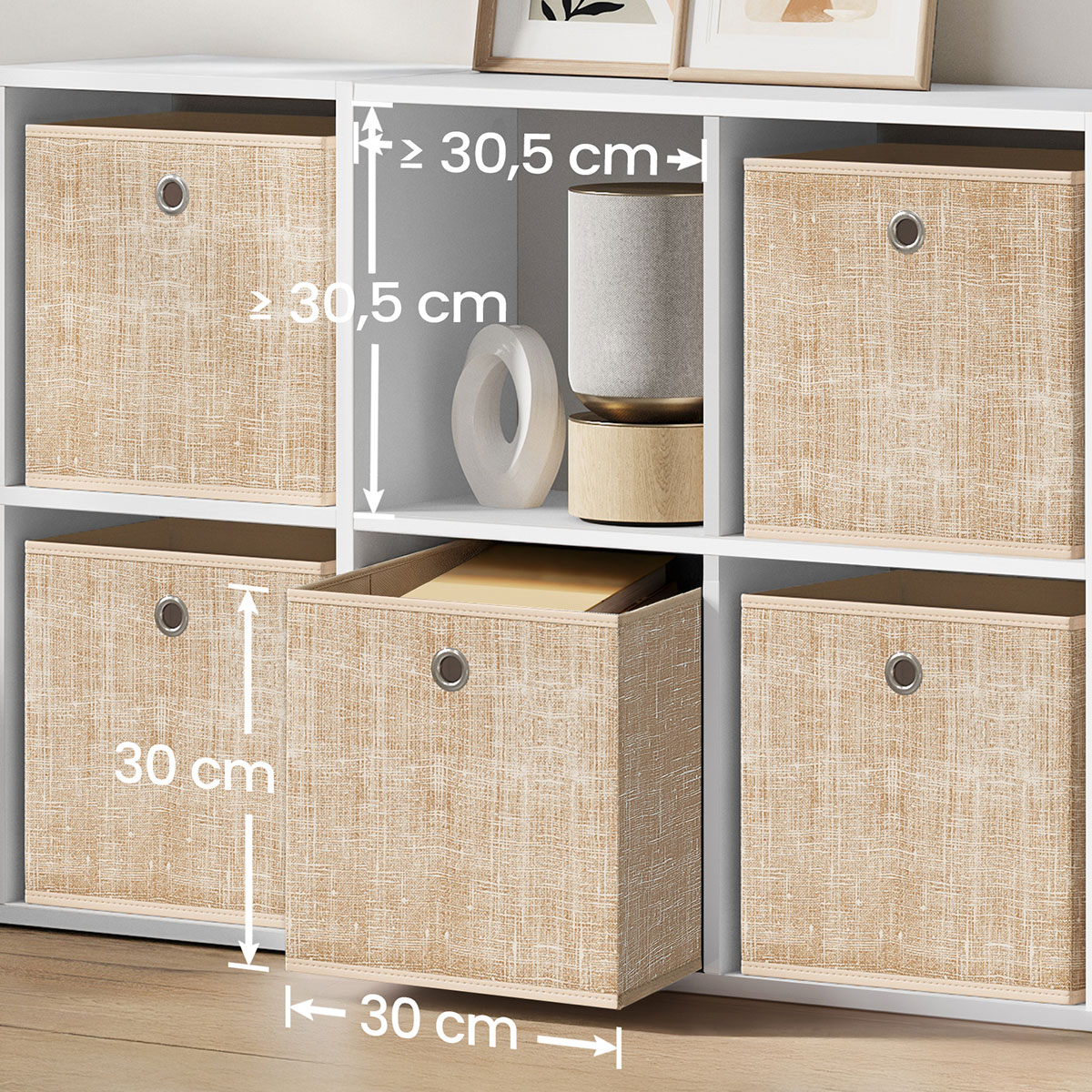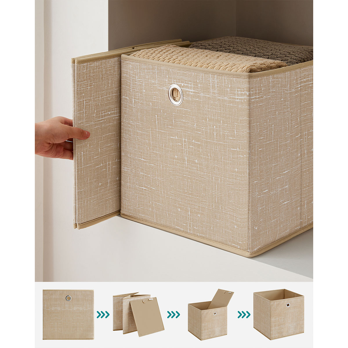 Κουτιά αποθήκευσης σε σετ 6 τεμαχίων με μίνιμαλ σχεδιασμό από την εταιρεία Songmics. Είναι κατασκευασμένα εξωτερικά από μπεζ συνθετικό ύφασμα non woven που αναπνέει και εσωτερικά από χαρτόνι για να κρατάνε το σχήμα τους. Μπορείτε να τα χρησιμοποιήσετε σαν αποθηκευτικό χώρο σε ράφια. Ιδανικά για να κρατήσουν οργανωμένα τα αντικείμενά σας, δίνοντας παράλληλα μια μοντέρνα πινελιά στην διακόσμηση σας. Όταν δεν χρησιμοποιούνται, μπορούν να διπλωθούν και να αποθηκευτούν για εξοικονόμηση χώρου. Μέγιστο βάρος αντοχής ανά κουτί: 5kg.