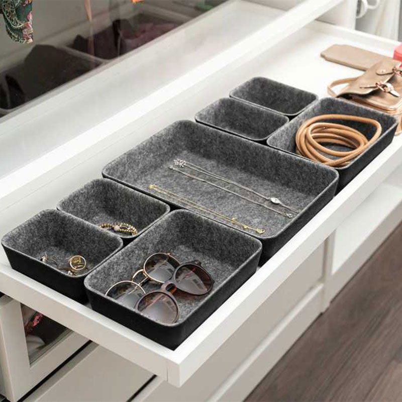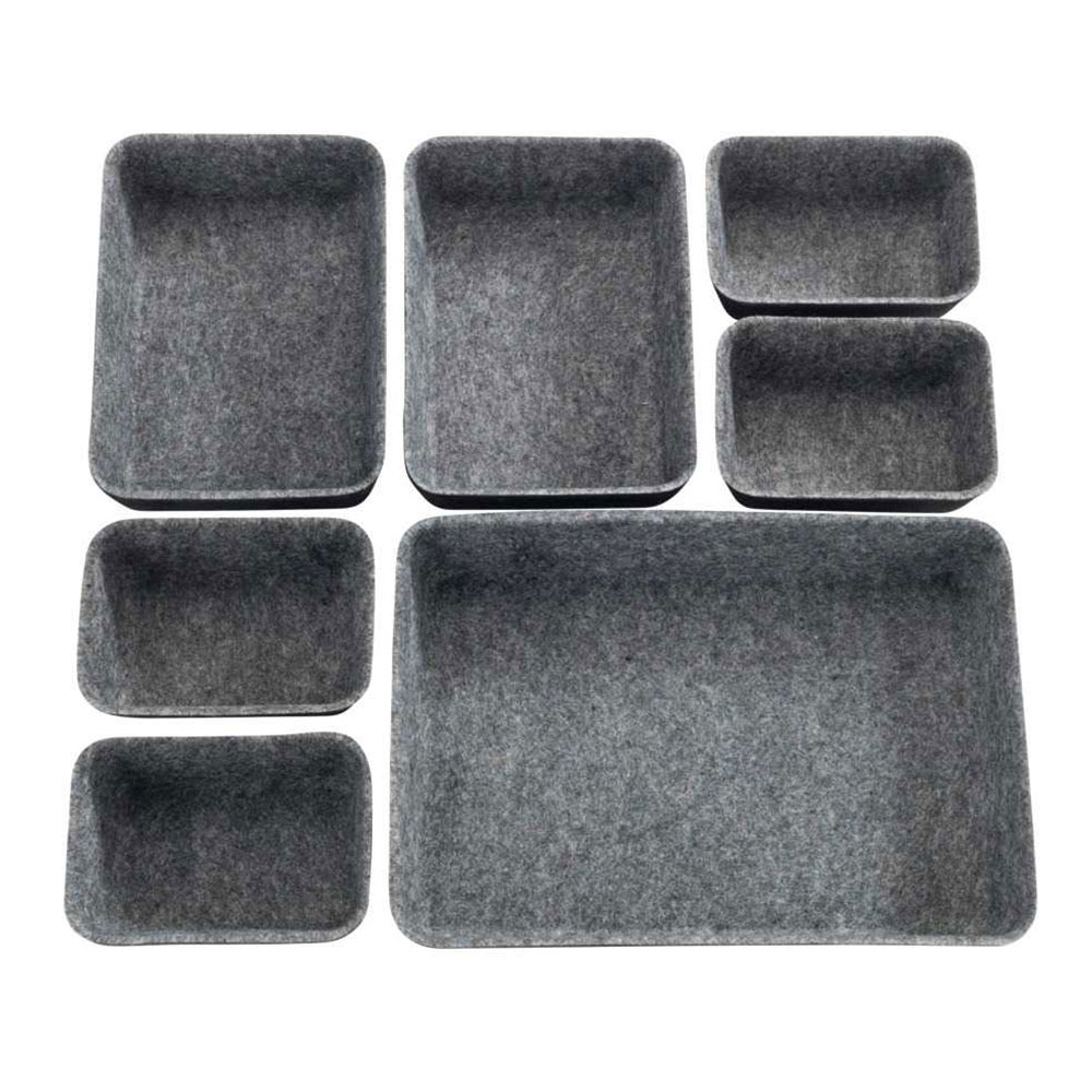 Organizer συρταριών της γερμανικής εταιρείας Wenko, σε σετ 7 τεμάχια διαφορετικών διαστάσεων για έχετε τακτοποιημένα και οργανωμένα τα αντικείμενά σας. Μπορείτε να τα τοποθετήσετε μέσα στα συρτάρια για να δημιουργήσετε χωρίσματα ή πάνω σε μια επιφάνεια. Έχουν γκρι χρώμα και είναι κατασκευασμένα από τσόχα.