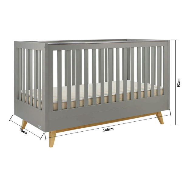 Κούνια που μετατρέπεται σε προεφηβικό κρεβάτι της εταιρείας Bebe Stars σε γκρι χρώμα με λεπτομέρειες σε φυσική απόχρωση ξύλου. Σχεδιασμένο σε μοντέρνες γραμμές που συμπληρώνουν κάθε στυλ δωματίου. Με ανθεκτικά κεκλιμένα πόδια, τοποθετημένα κάτω από ένα ισχυρό πλαίσιο με τις 4 πλευρές να επιτρέπουν την κυκλοφορία του αέρα. Η βάση του στρώματος έχει 2 επίπεδα για να μπορείτε εύκολα να προσαρμόσετε το ύψος του κρεβατιού, για την καλύτερη ασφάλεια του μωρού και μεγαλύτερη άνεση της μητέρας. Τα πλαϊνά κάγκελα μπορούν να αφαιρεθούν όταν το παιδί είναι έτοιμο για την μετάβαση σε προεφηβικό κρεβάτι. Διαθέτει προστατευτικό για την οδοντοφυΐα από διαφανές μη τοξικό υλικό στο επάνω μέρος των κάγκελων. Δέχεται στρώμα 70x140 (Δεν περιλαμβάνεται). Κατασκευασμένο από μασίφ ξύλο πεύκου και υψηλής ποιότητας μελαμίνη με μη τοξικά φινιρίσματα. Εναρμονισμένο με το Ευρωπαϊκό Πρότυπο Ασφαλείας EN 716-1:2017+AC:2019 & EN 716-2:2017. Βαμμένο με μη τοξικά χρώματα, απόλυτα ασφαλή για το παιδί. Το προϊόν χρειάζεται συναρμολόγηση.