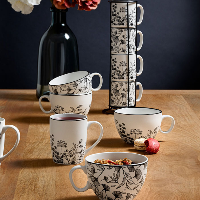 Πορσελάνινη κούπα με φλοράλ σχέδιο σε λευκό χρώμα με μαύρες λεπτομέρειες. Ιδανική για να απολαύσετε οποιοδήποτε ζεστό ρόφημα ή καφέ. Χωρητικότητας 340ml.