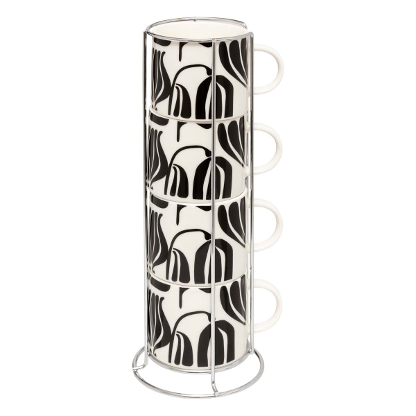 Κεραμικές κούπες σετ 4 τεμαχίων, με μοντέρνο σχέδιο σε μαύρο και λευκό χρώμα. Διαθέτουν μεταλλικό σταντ για να μπορείτε να τις οργανώσετε πάνω στον πάγκο της κουζίνας σας. Χωρητικότητας 230ml.