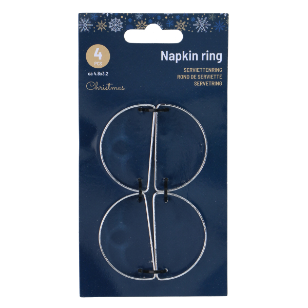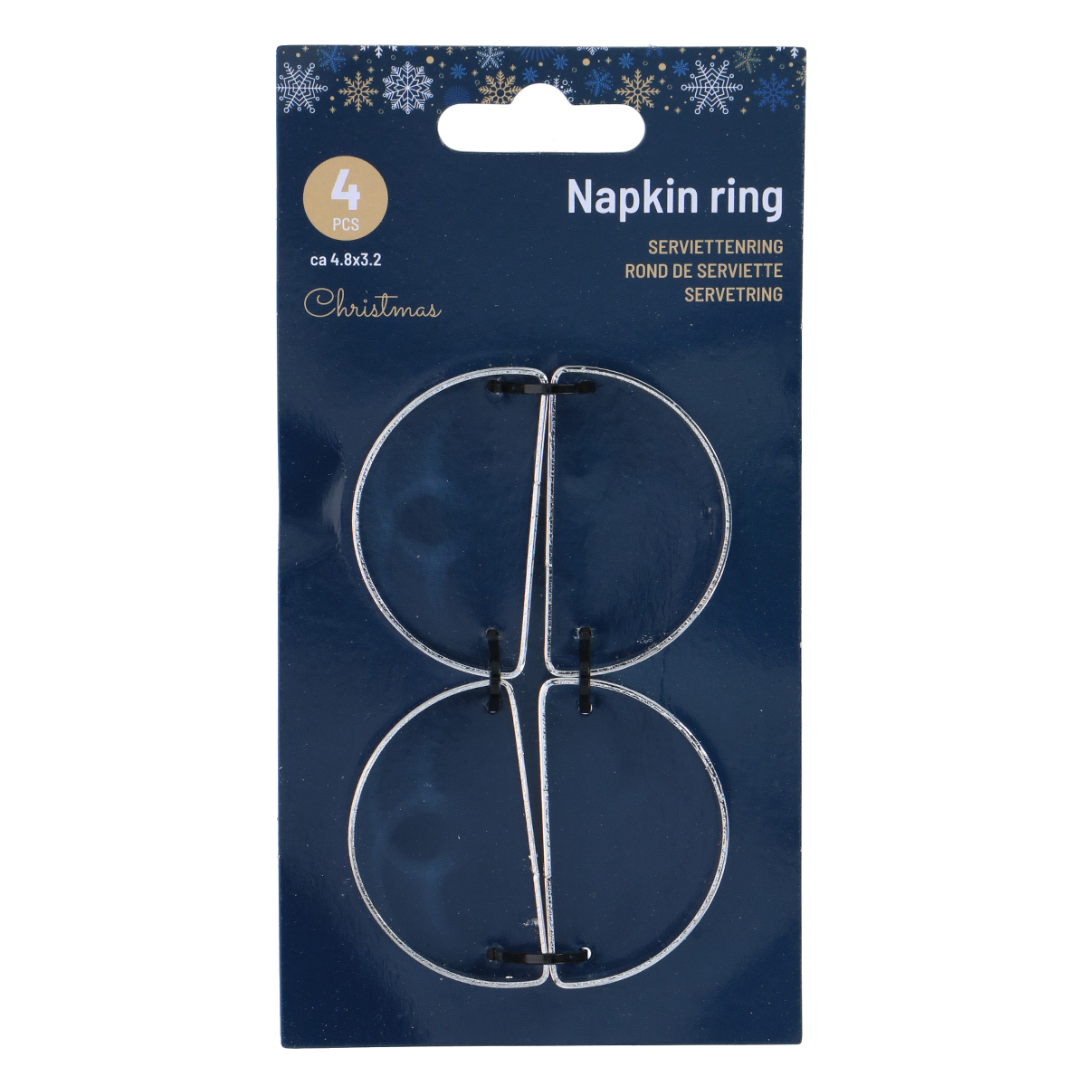 Δαχτυλίδια για πετσέτες φαγητού σετ 4 τεμαχίων από την εταιρεία Alpina. Είναι κατασκευασμένα από μεταλλικό υλικό σε ασημί χρώμα. Τυλίξτε τις πετσέτες του τραπεζιού για έναν αέρα πραγματικής πολυτέλειας στο γεύμα σας. Ιδανικά για το χριστουγεννιάτικο τραπέζι σας.